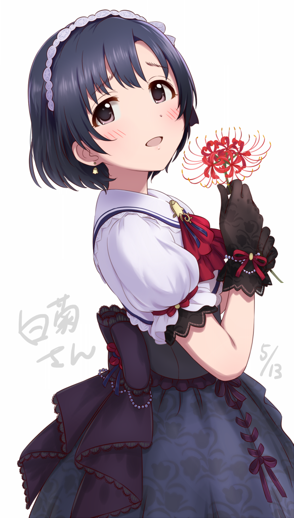 1girl ascot black_gloves black_hair black_skirt blush bow breasts brown_eyes character_name dani-ikapi dot_nose earrings flower from_side gloves headband holding holding_flower idolmaster idolmaster_cinderella_girls idolmaster_cinderella_girls_starlight_stage jewelry looking_at_viewer open_mouth purple_bow red_ascot red_flower shiragiku_hotaru shirt short_hair short_sleeves simple_background skirt small_breasts smile solo spider_lily waist_bow white_background white_headband white_shirt