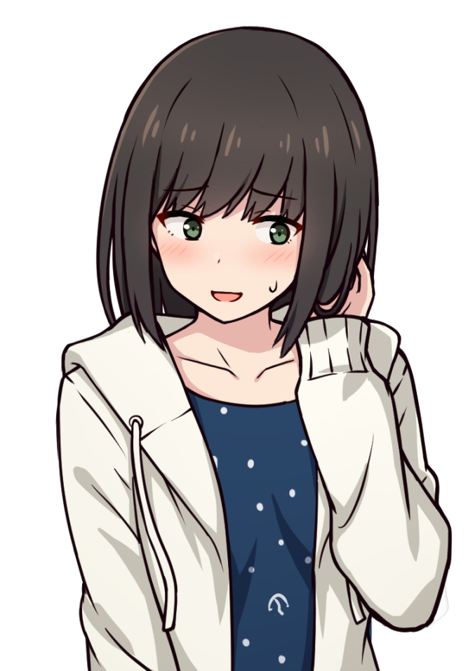 1girl black_hair blue_dress dress fubuki_(kancolle) fubuki_(spring)_(kancolle) green_eyes hood hooded_jacket jacket kantai_collection medium_hair nakamura_sumikage official_alternate_costume official_alternate_hairstyle polka_dot polka_dot_dress simple_background solo upper_body white_background white_jacket