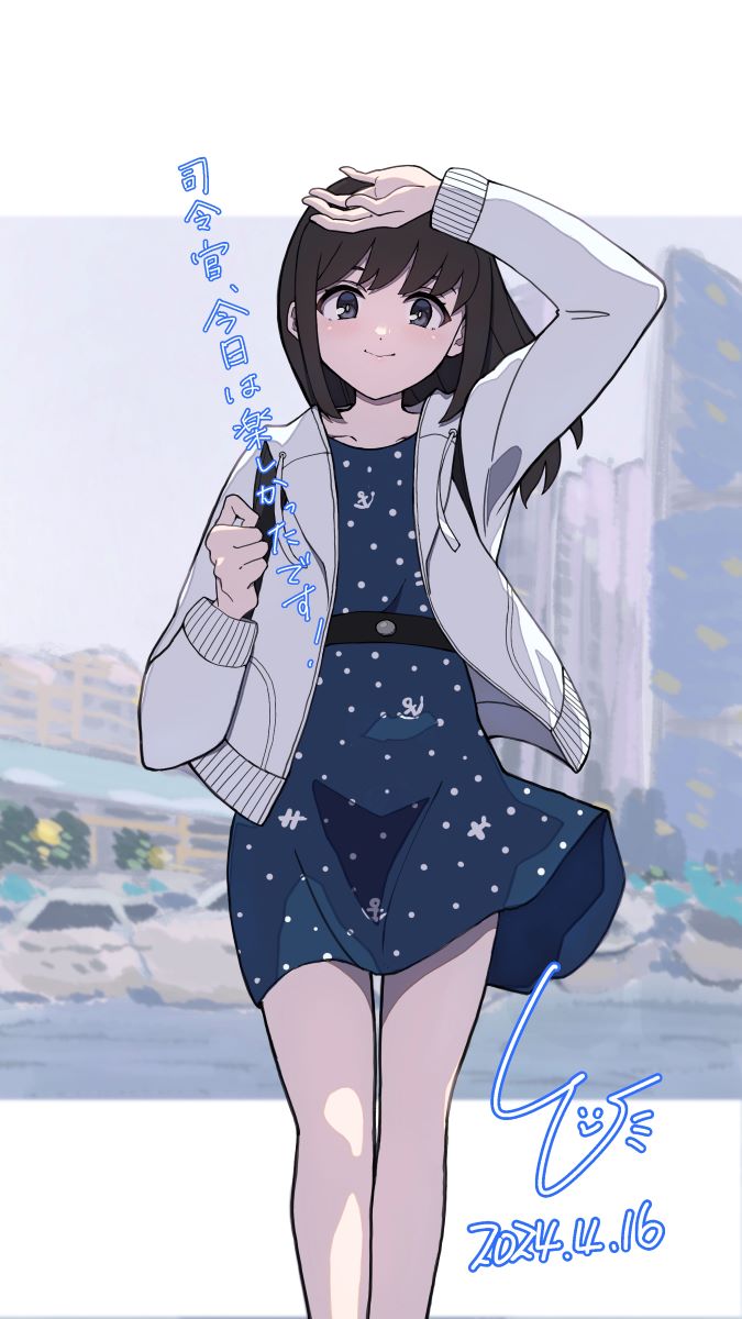 1girl black_hair blue_dress building dated dress feet_out_of_frame fubuki_(kancolle) fubuki_(spring)_(kancolle) green_eyes highres hood hooded_jacket jacket kantai_collection ld_(luna_dial398) medium_hair official_alternate_costume official_alternate_hairstyle photo_background polka_dot polka_dot_dress signature simple_background solo translation_request white_background white_jacket