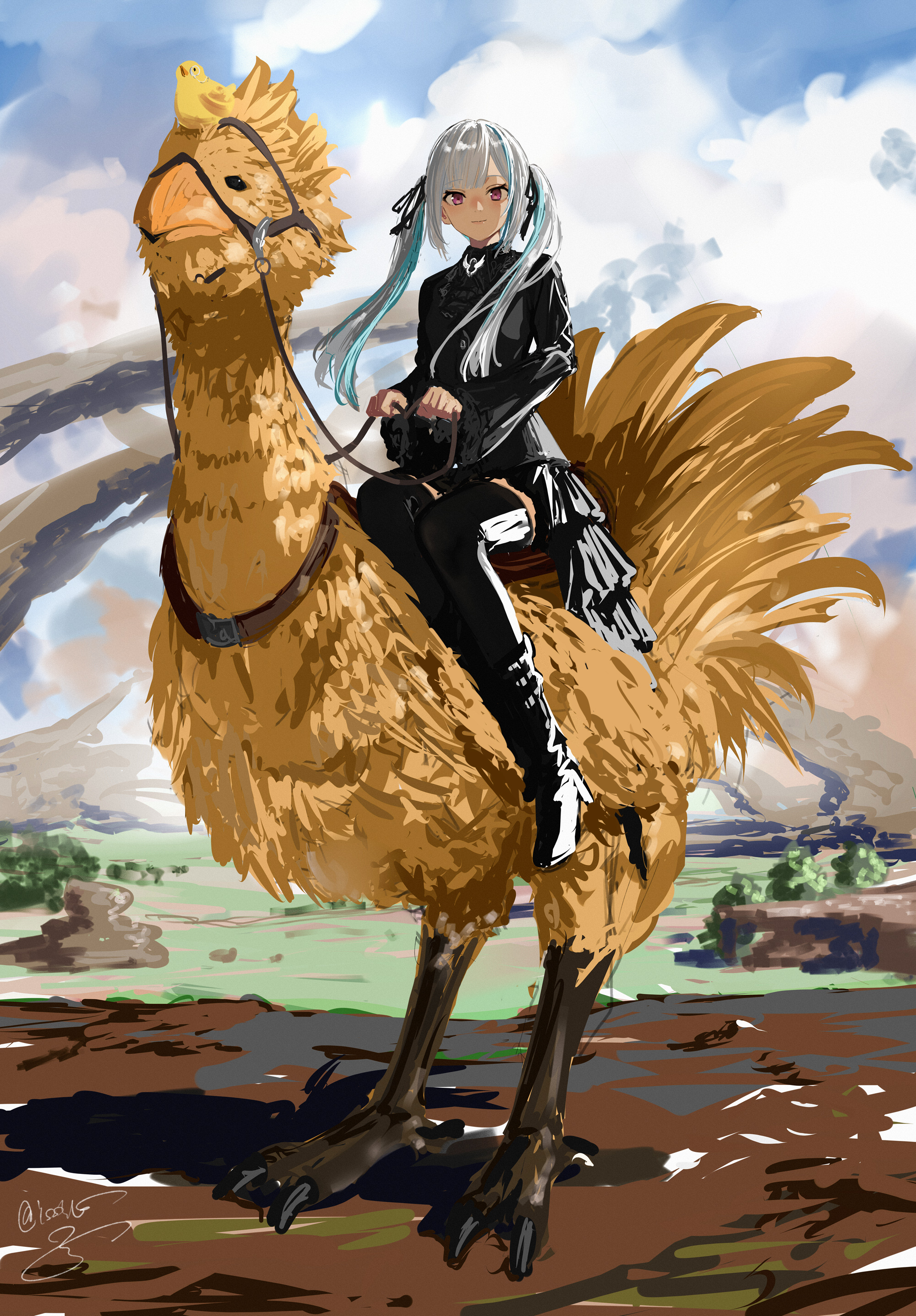 1girl absurdres aqua_hair bird black_dress black_suit black_thighhighs blunt_bangs brooch canyon chocobo dress final_fantasy final_fantasy_xv formal_clothes frilled_dress frilled_sleeves frills full_body highres holding holding_reins isshiki_(ffmania7) jewelry lize_helesta looking_at_viewer multicolored_hair nijisanji outdoors purple_eyes reins riding riding_animal sebastian_piyodore sidelocks signature sitting smile solo standing streaked_hair suit thighhighs twintails virtual_youtuber white_hair