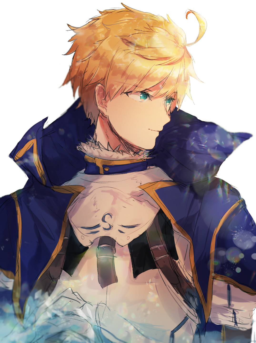 1boy ahoge aqua_eyes armor arthur_pendragon_(fate) blonde_hair blue_cape breastplate cape closed_mouth ebi_(6_5) facing_to_the_side fate/grand_order fate_(series) highres looking_ahead male_focus short_hair simple_background smile solo upper_body white_background