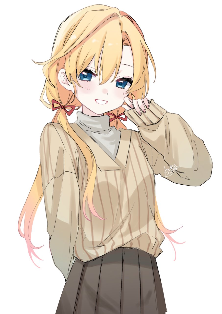 1girl abukuma_(kancolle) abukuma_(round1)_(kancolle) black_skirt blonde_hair blue_eyes cowboy_shot highres kamisuiori kantai_collection long_hair low_twintails official_alternate_costume official_alternate_hairstyle pleated_skirt ribbed_sweater simple_background skirt solo sweater twintails white_background white_sweater
