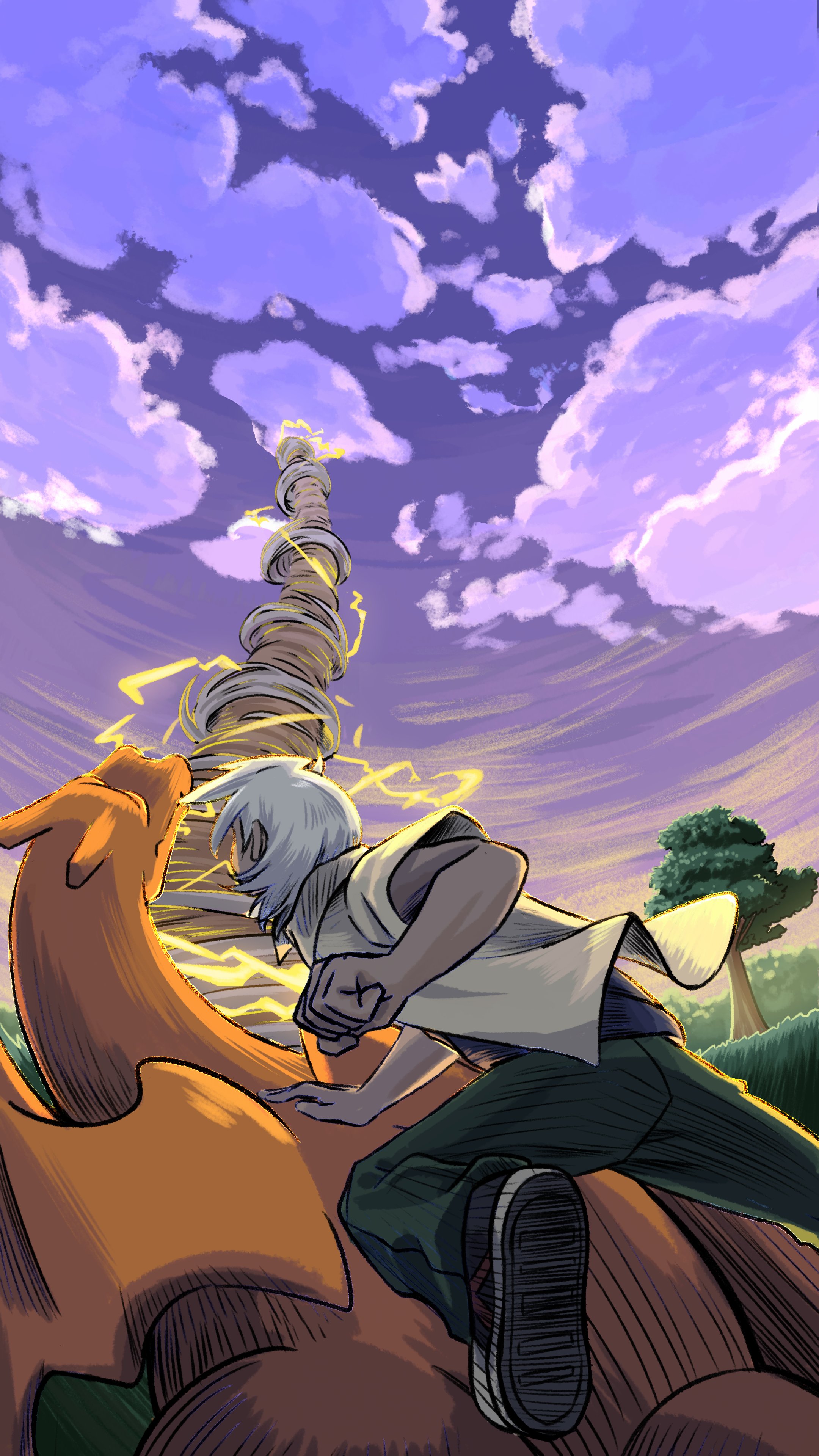 1boy absurdres charizard clenched_hand cloud commentary_request electricity friede_(pokemon) from_behind gen_1_pokemon grass highres le4ng_liing male_focus nintendo outdoors pants pokemon pokemon_(anime) pokemon_(creature) pokemon_horizons shirt shoes sky tree twilight white_hair