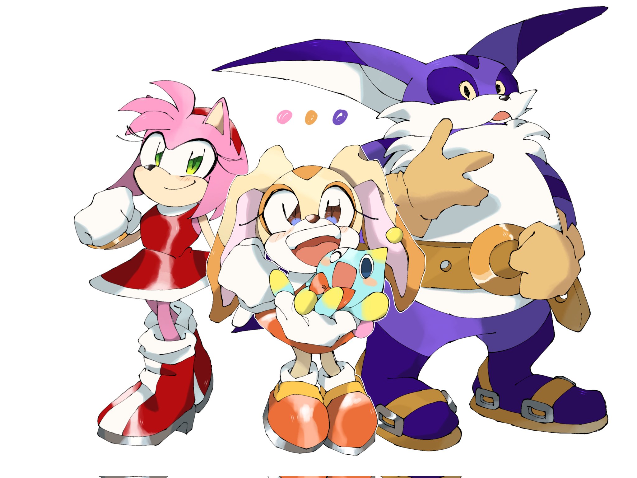2boys 2girls amy_rose animal_ears belt big_the_cat blue_eyes blush_stickers bow bowtie carrying cat_ears chao_(sonic) cheese_(sonic) colored_sclera cream_the_rabbit eyelashes furry gloves green_eyes hairband height_difference highres kayama_yosi_(yosiyosi) long_ears multiple_boys multiple_girls open_mouth pink_hair rabbit_ears sandals shoes skirt smile sonic_(series) standing white_background yellow_sclera
