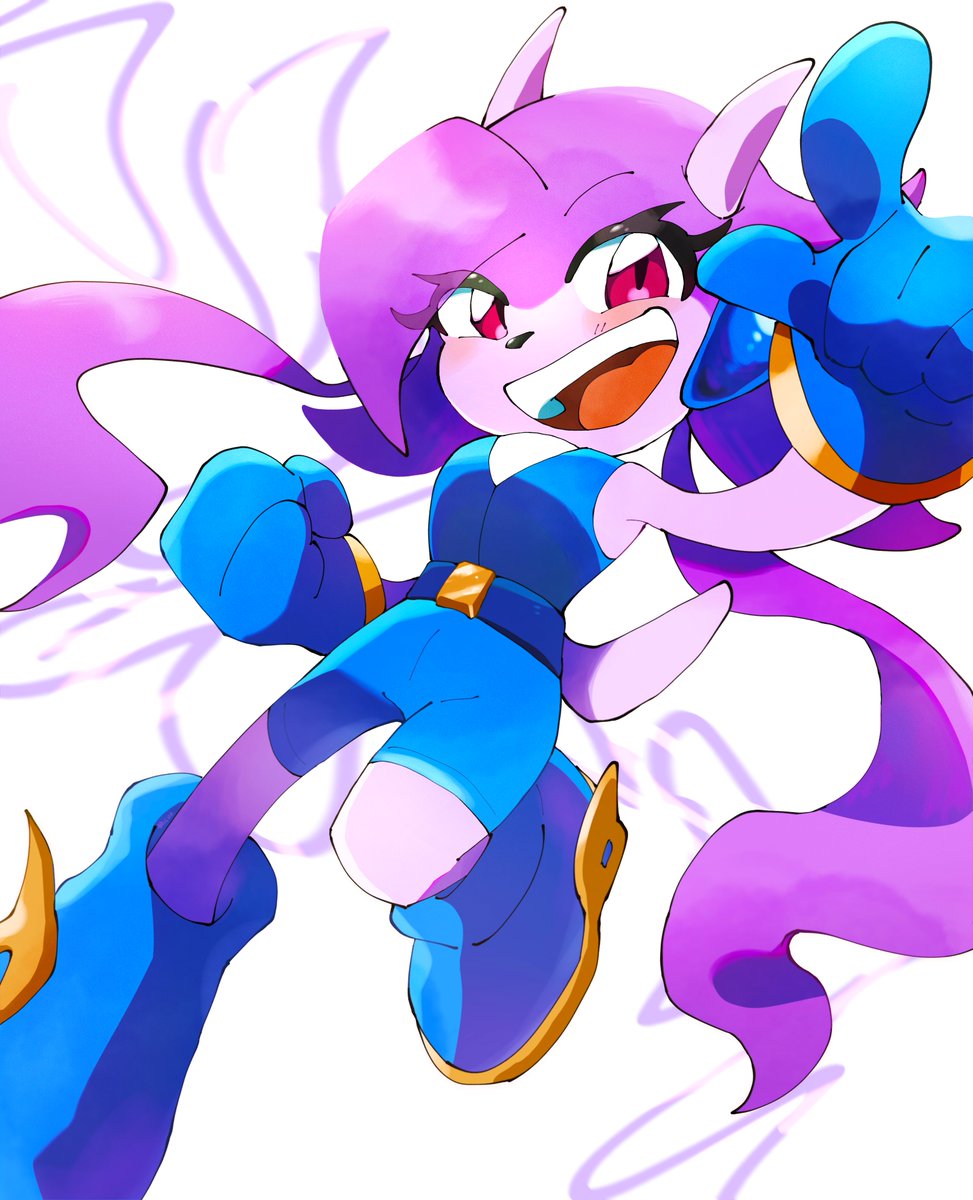 1girl belt boots breasts dragon_girl dragon_horns dragon_tail eyelashes freedom_planet furry galaxytrail gloves headgear highres horns kayama_yosi_(yosiyosi) looking_at_viewer medium_breasts open_mouth pink_eyes pointing pointing_at_viewer purple_hair sash_lilac smile tail twintails unitard white_background