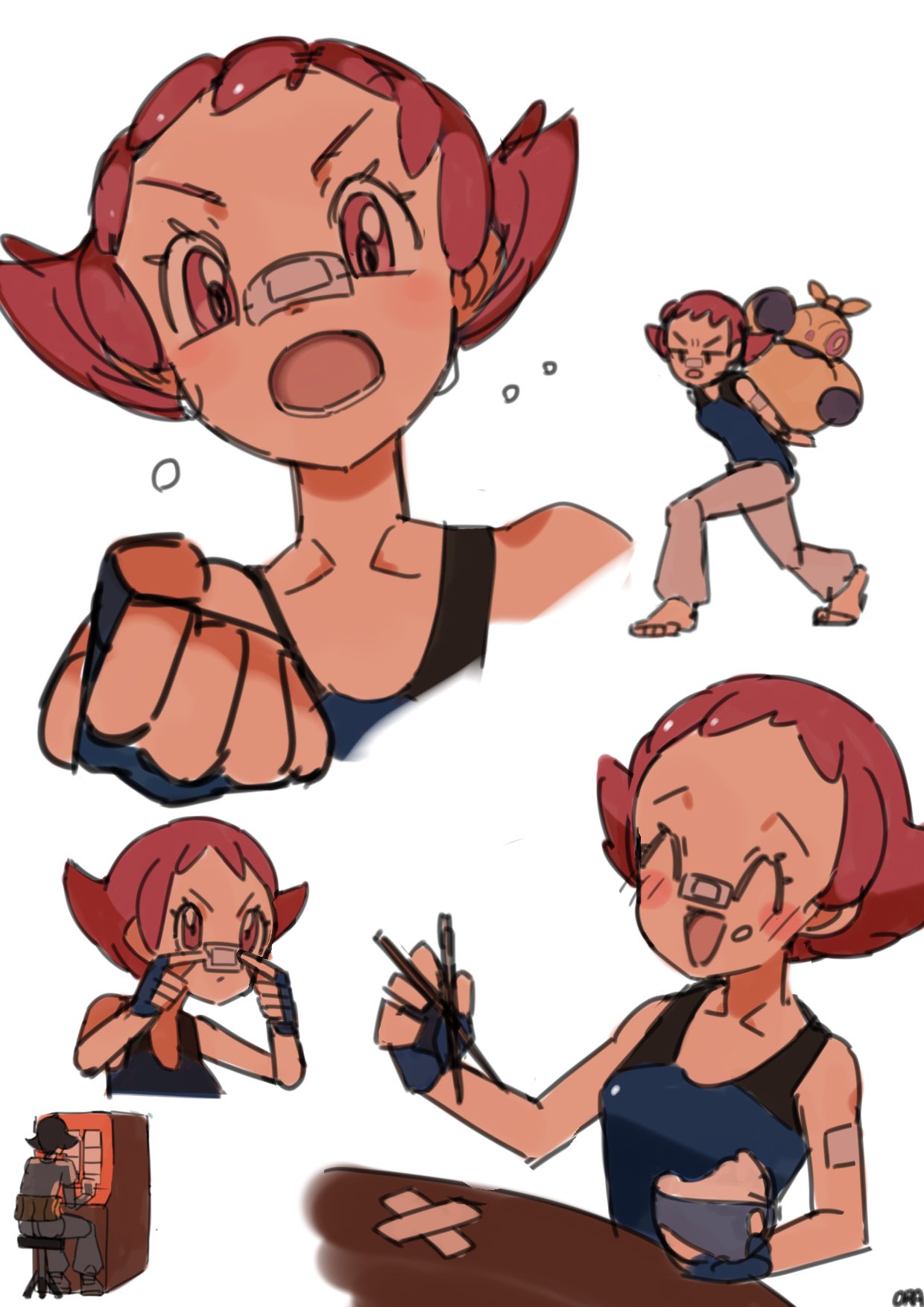 1girl :d ^_^ bandaid bandaid_on_face bandaid_on_nose barefoot blush_stickers bowl carrying chopsticks clenched_hand closed_eyes collarbone commentary_request fingerless_gloves gen_3_pokemon gloves highres holding holding_chopsticks lower_teeth_only makuhita maylene_(pokemon) multiple_views nintendo open_mouth ora_(oraora_oekaki) pink_eyes pink_hair pokemon pokemon_(creature) pokemon_dppt rice simple_background smile teeth toes white_background
