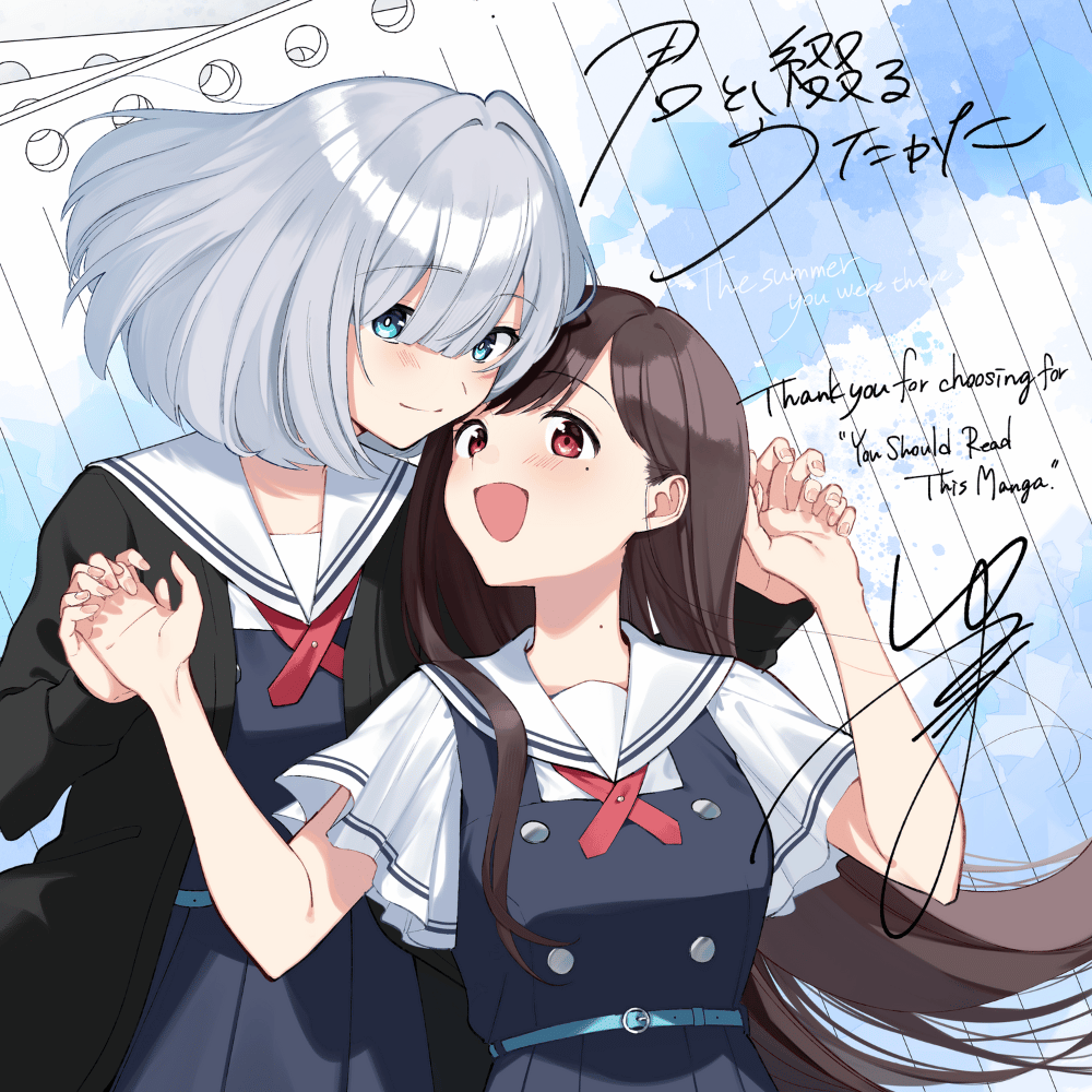 2girls asaka_kaori belt belt_buckle black_cardigan blue_belt blue_dress blue_eyes blush brown_hair buckle cardigan closed_mouth copyright_name dress floating_hair grey_hair hair_behind_ear hair_between_eyes holding_hands hoshikawa_shizuku kimi_to_tsuzuru_utakata long_hair looking_at_viewer mole mole_on_neck mole_under_eye multiple_girls neck_ribbon official_art open_cardigan open_clothes open_mouth pinafore_dress red_eyes red_ribbon ribbon sailor_collar school_uniform second-party_source shirt short_hair short_sleeves sleeveless sleeveless_dress thank_you upper_body white_sailor_collar white_shirt yuama yuri
