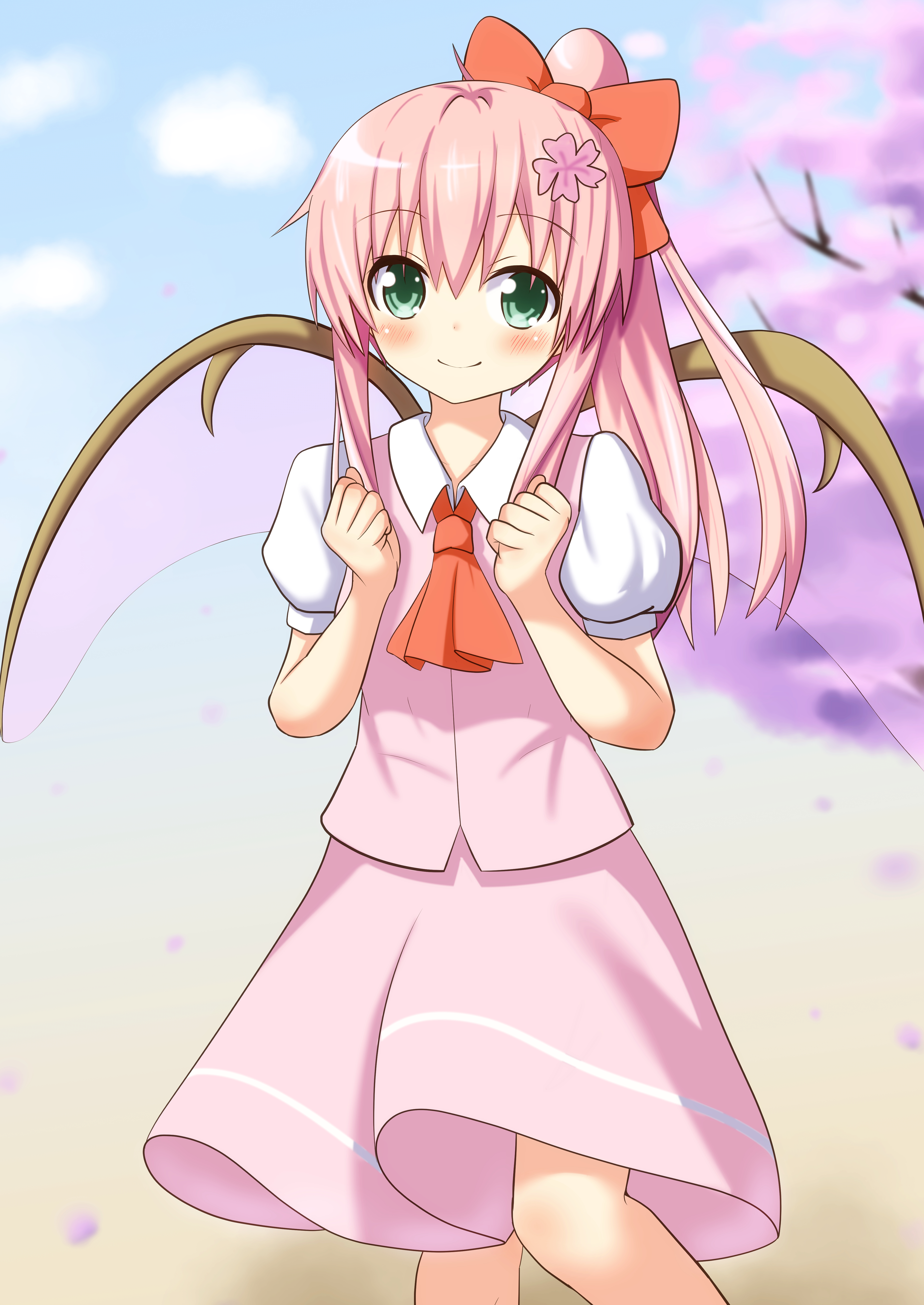 1girl absurdres alternate_color cherry_blossoms cherry_tree cloud cowboy_shot daiyousei dress fairy fairy_wings green_eyes highres hikuchi_riku petals pink_dress pink_hair red_ribbon ribbon sakura_daiyousei shirt side_ponytail smile solo touhou white_shirt wings