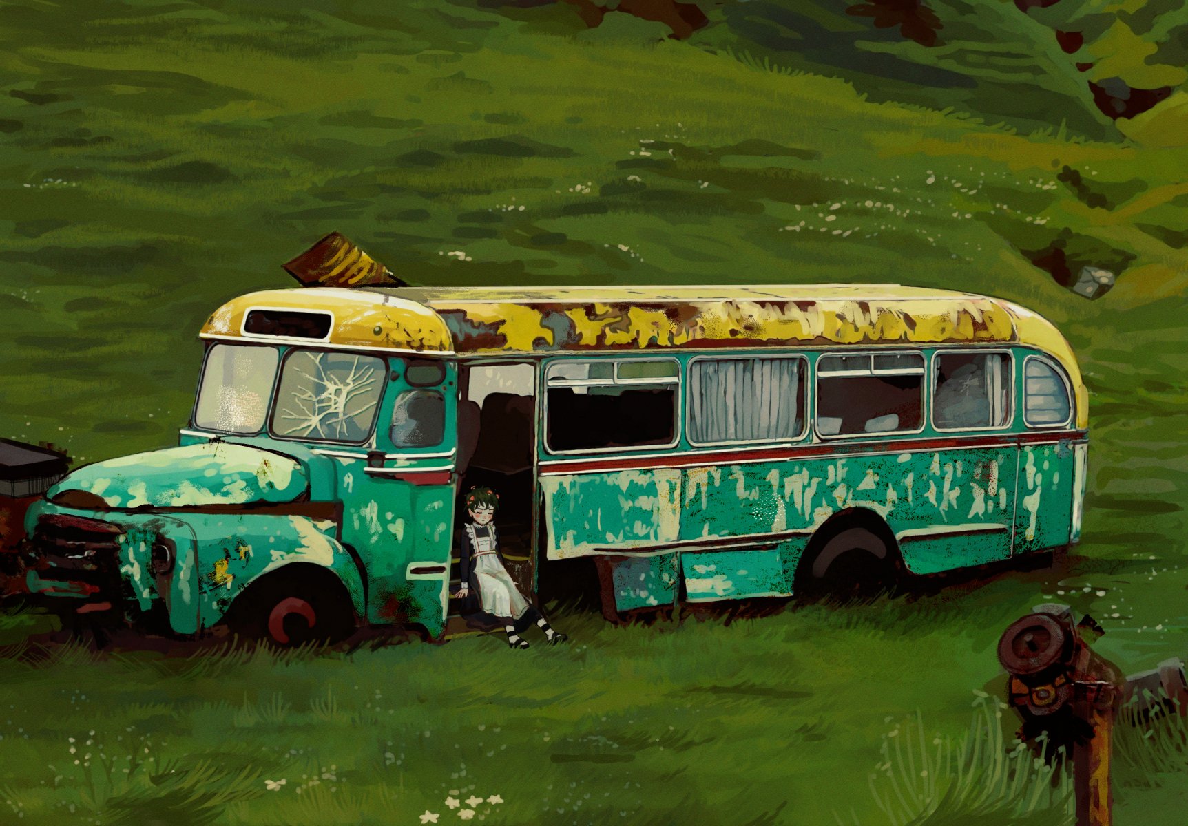 1girl abandoned apron broken_window bus dress grass highres hill io_(onisarashi) maid motor_vehicle nature original outdoors rust scenery sitting solo