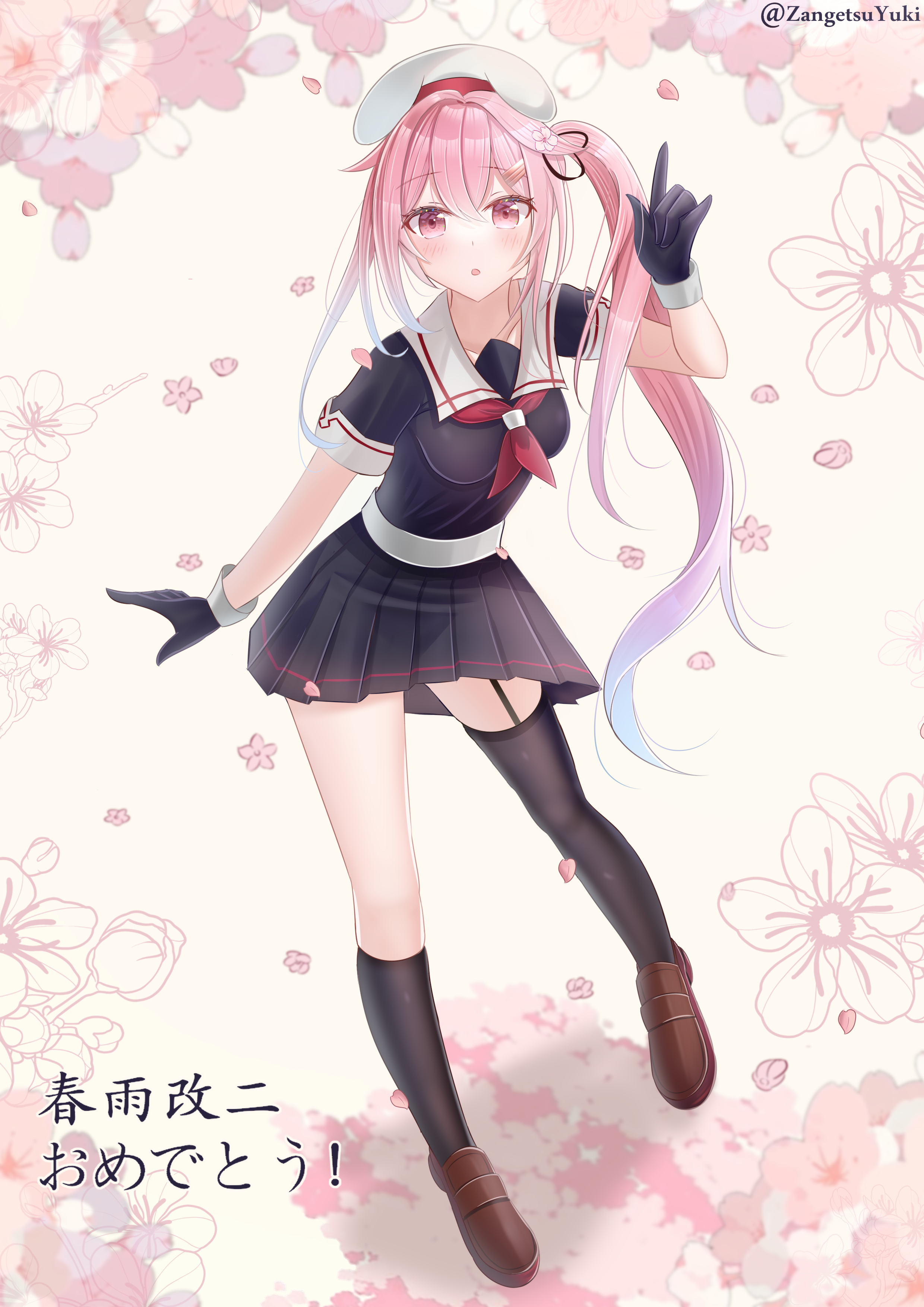 1girl absurdres asymmetrical_legwear black_gloves black_serafuku black_skirt blue_hair brown_shoes character_name cherry_blossoms flower full_body garter_straps gloves gradient_hair hair_flower hair_ornament hairclip harusame_(kancolle) harusame_kai_ni_(kancolle) hat highres kantai_collection loafers looking_at_viewer multicolored_hair neckerchief pink_eyes pink_hair pleated_skirt red_neckerchief sailor_collar sailor_hat sailor_shirt school_uniform serafuku shirt shoes side_ponytail single_garter_strap single_thighhigh skirt solo thighhighs twitter_username white_sailor_collar zangetsu_yuki_yuki