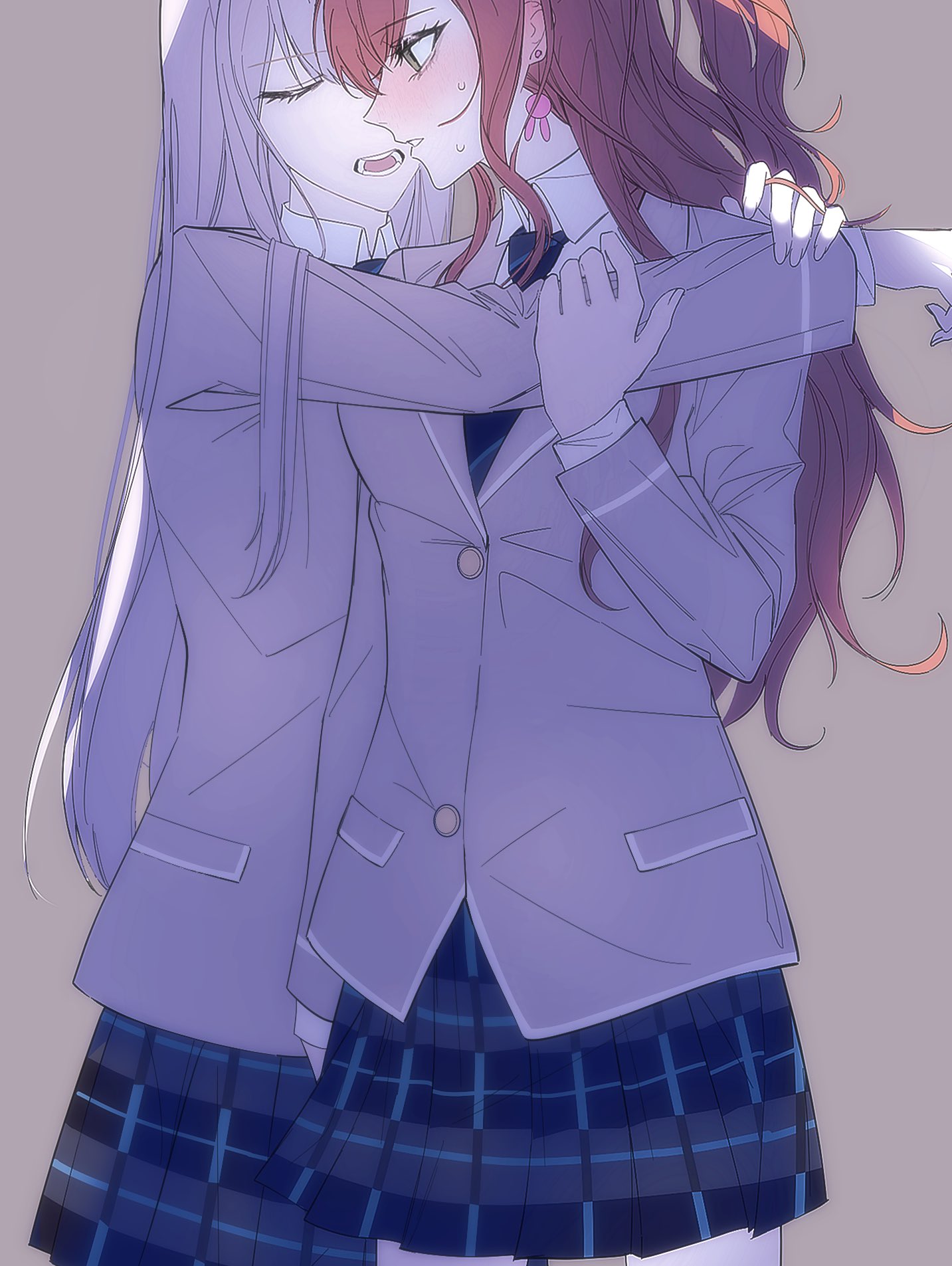 2girls bang_dream! bang_dream!_girls_band_party! blazer blue_shirt blue_skirt blush brown_hair closed_eyes collared_shirt commentary_request diagonal-striped_clothes diagonal-striped_necktie dress_shirt earrings green_eyes grey_background grey_hair grey_jacket half_updo haneoka_school_uniform highres hug imai_lisa jacket jewelry korean_commentary long_hair long_sleeves minato_yukina multiple_girls necktie nervous_sweating open_mouth plaid_clothes plaid_skirt pleated_skirt school_uniform shirt simple_background skirt sooyo211 striped_clothes sweat teeth white_shirt yuri