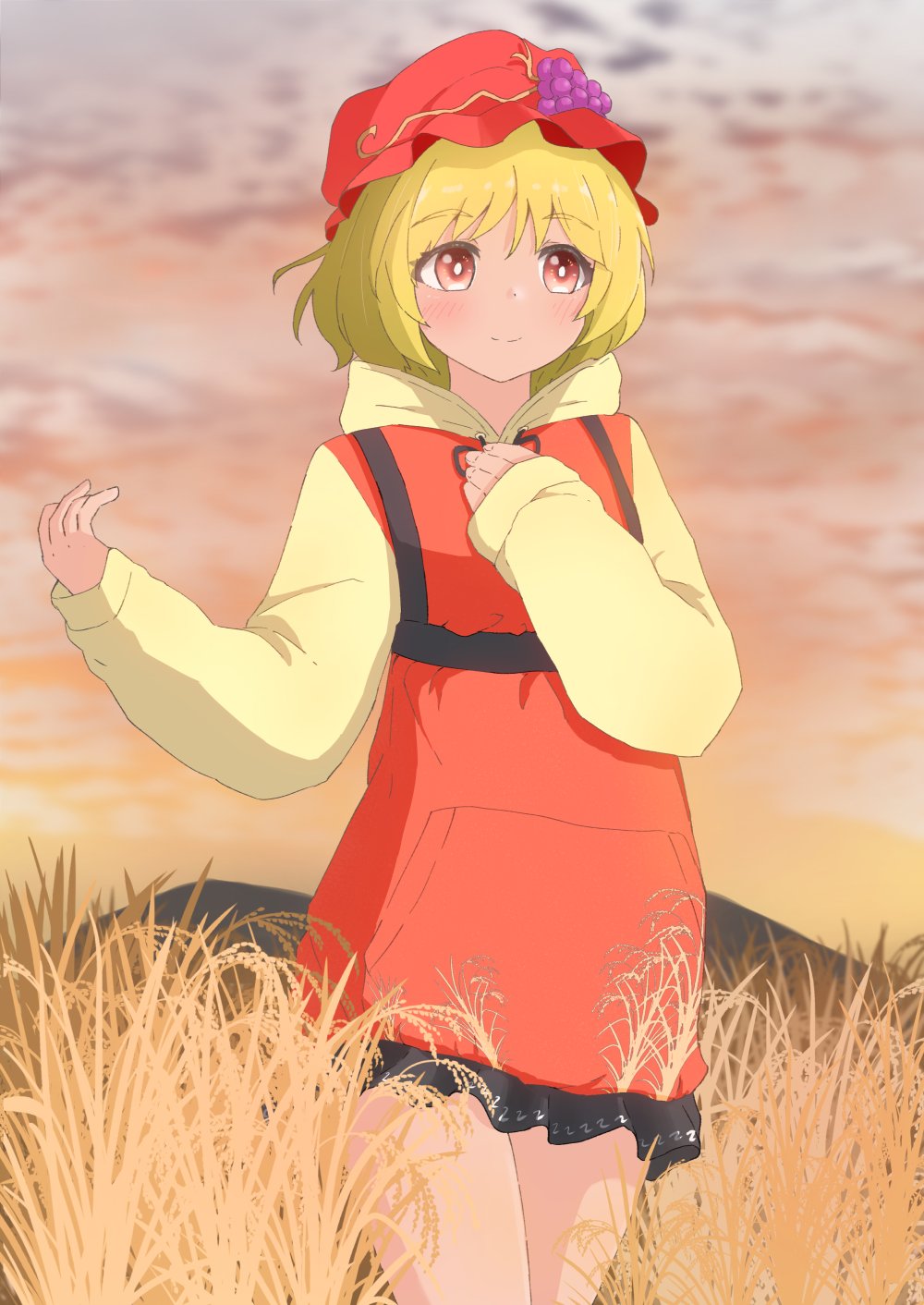 1girl adapted_costume aki_minoriko bare_legs blonde_hair closed_mouth commentary_request cowboy_shot frilled_hoodie happy hat highres hood hood_down hoodie mizune_(winter) mob_cap mountainous_horizon orange_eyes orange_hat orange_hoodie outdoors short_hair smile solo touhou yellow_hoodie