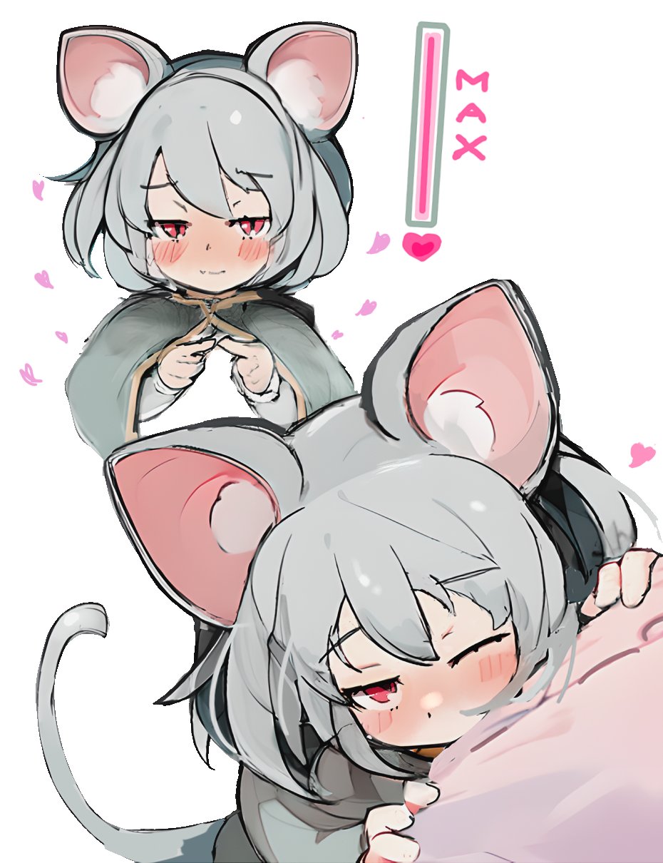 1girl affection_meter affectionate animal_ear_fluff animal_ears blush capelet english_text grey_hair heart highres index_fingers_together jewelry large_ears long_sleeves looking_at_viewer mouse_ears mouse_tail nazrin one_eye_closed pendant red_eyes simple_background tail touhou white_background yoshiyuki_(14330975)