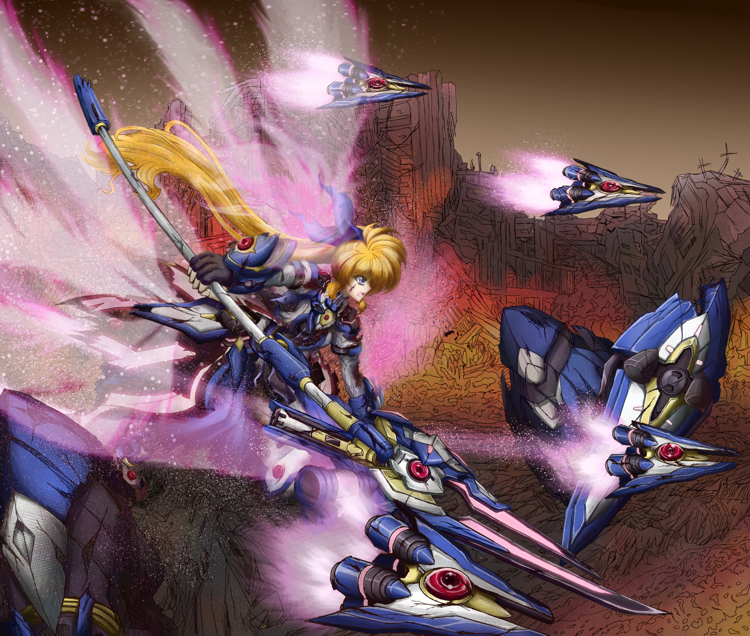 1girl blood broken broken_weapon brown_hair energy_wings fortress_(nanoha) highres holding holding_weapon injury itutooki_kousin lyrical_nanoha mahou_shoujo_lyrical_nanoha_detonation mahou_shoujo_lyrical_nanoha_strikers raising_heart raising_heart_(blaster_bit) raising_heart_estrea solo takamachi_nanoha takamachi_nanoha_(formula_ii) weapon