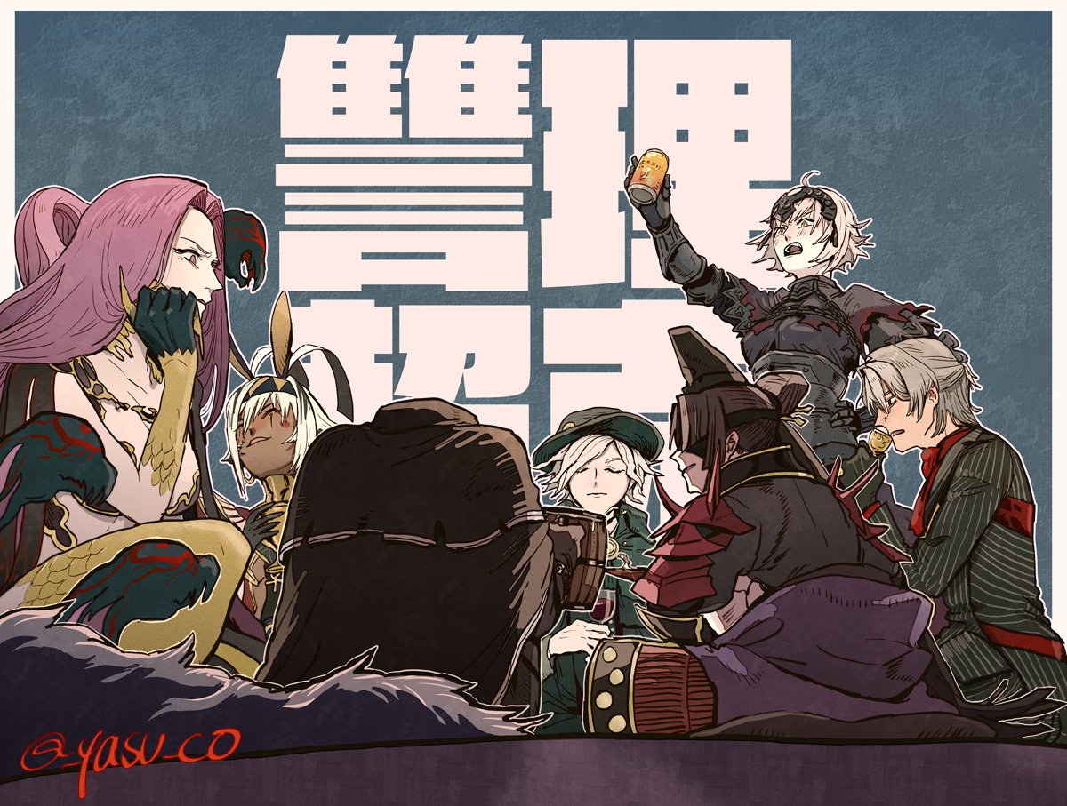 3boys 4girls ahoge animal_ears antonio_salieri_(fate) antonio_salieri_(second_ascension)_(fate) beer_can beer_mug black_hair blindfold can cup dark-skinned_female dark_skin drink_can drinking_glass edmond_dantes_(fate) fate/grand_order fate_(series) gorgon_(fate) grey_hair hat headless hessian_(fate) jeanne_d'arc_alter_(avenger)_(fate) jeanne_d'arc_alter_(fate) lobo_(fate) long_hair medusa_(fate) medusa_(rider)_(fate) mug multiple_boys multiple_girls nitocris_(fate) nitocris_alter_(fate) purple_hair rider sitting taira_no_kagekiyo_(fate) taira_no_kagekiyo_(second_ascension)_(fate) twitter_username ushiwakamaru_(fate) white_hair wine_glass yasuko_(kingugidora)