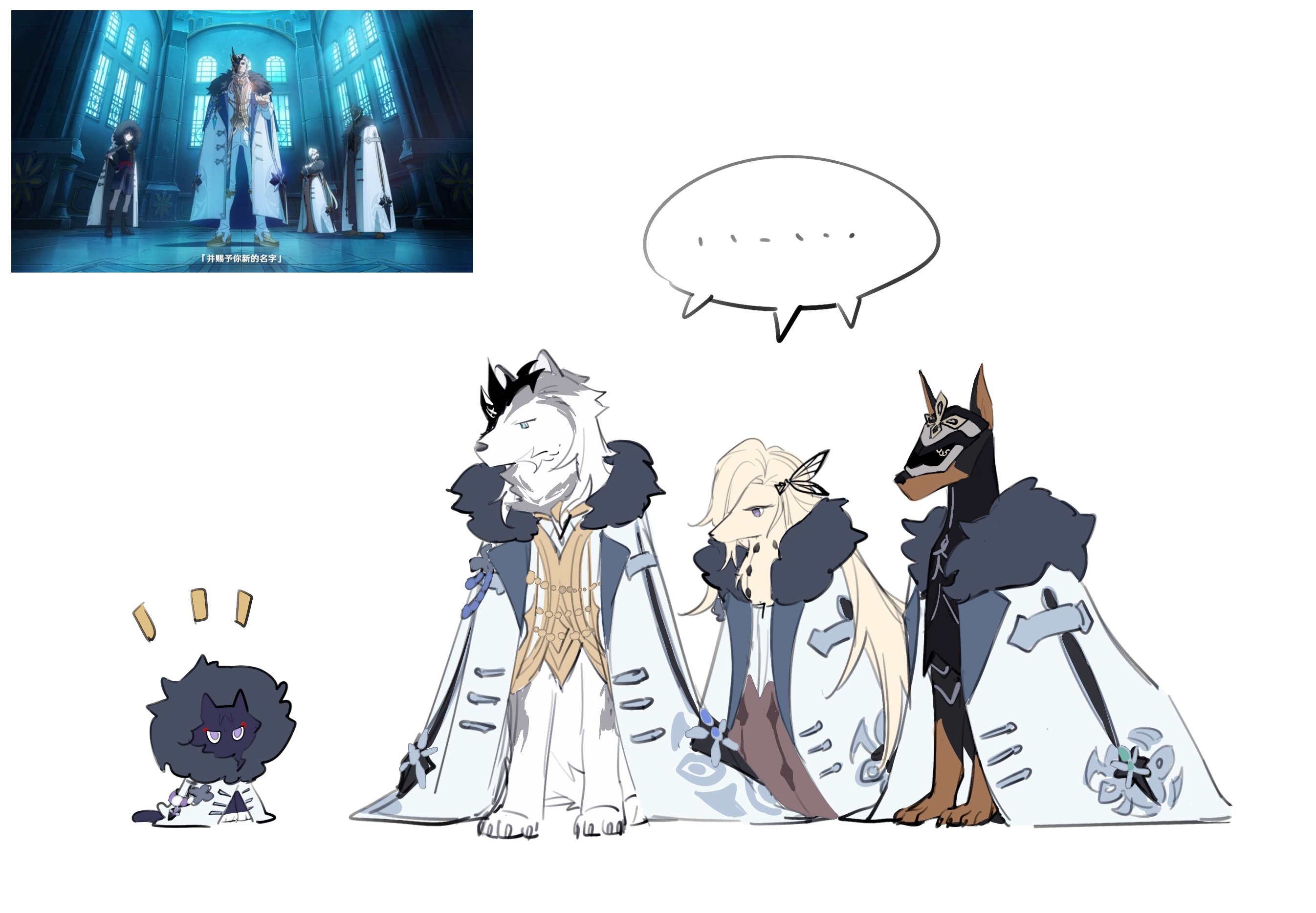 ... 1girl 3boys animal animal_focus animalization capitano_(genshin_impact) cat clothed_animal coat dog fatui_coat fur-trimmed_coat fur_trim genshin_impact highres hood hood_up hooded_coat mask multiple_boys multiple_girls pierro_(genshin_impact) reference_inset scaramouche_(cat)_(genshin_impact) scaramouche_(genshin_impact) signora_(genshin_impact) simple_background spoken_ellipsis white_background yue18yi
