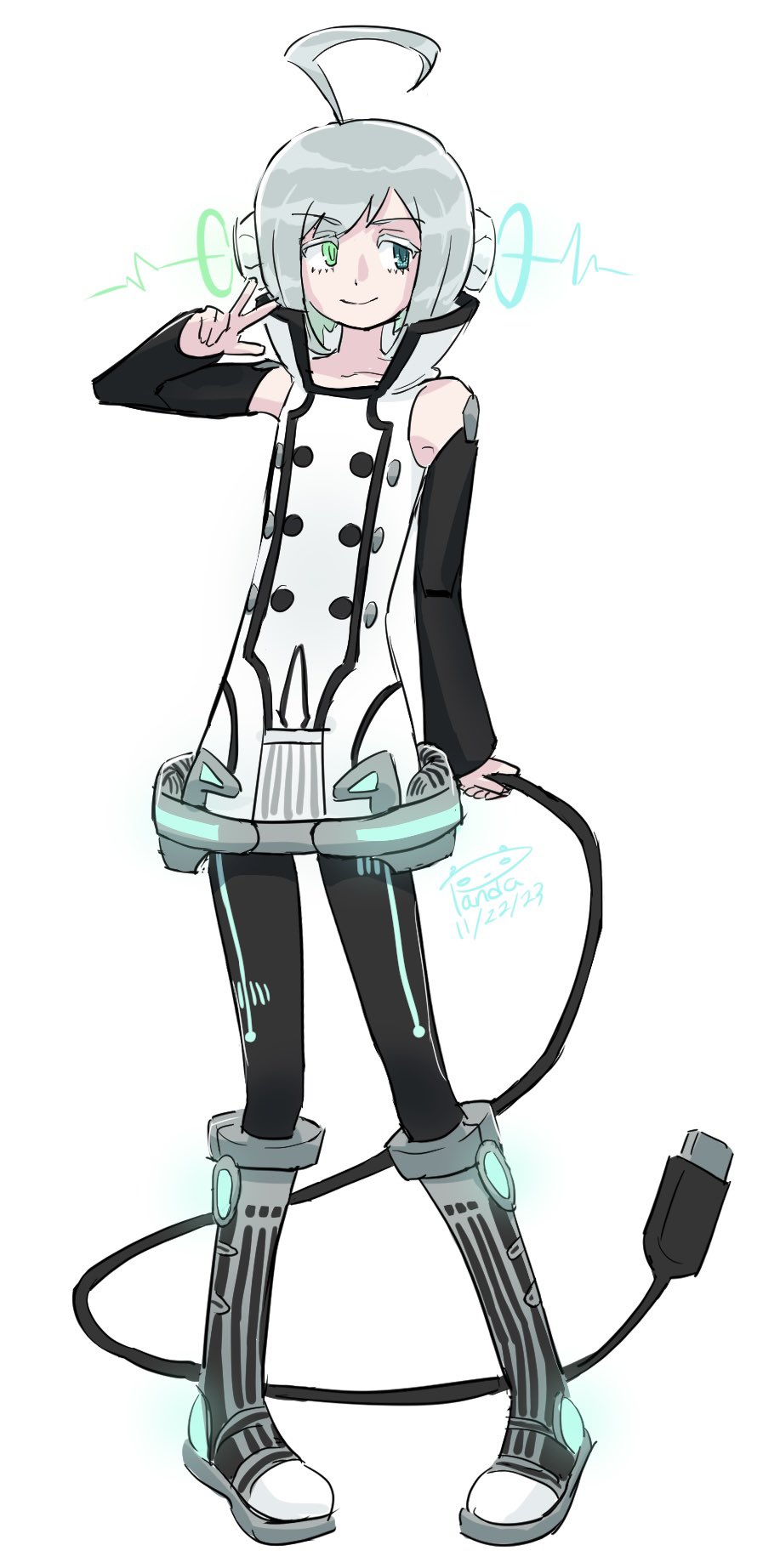 1boy 2023 ahoge androgynous black_sleeves black_thighhighs blue_eyes closed_mouth collarbone commentary dated detached_sleeves english_commentary full_body green_eyes grey_footwear headphones heterochromia highres holding_own_tail huge_ahoge looking_to_the_side male_focus panda_doodles shirt short_hair signature simple_background sleeveless sleeveless_shirt smile solo tail thighhighs usb utatane_piko v vocaloid watermark white_background white_shirt