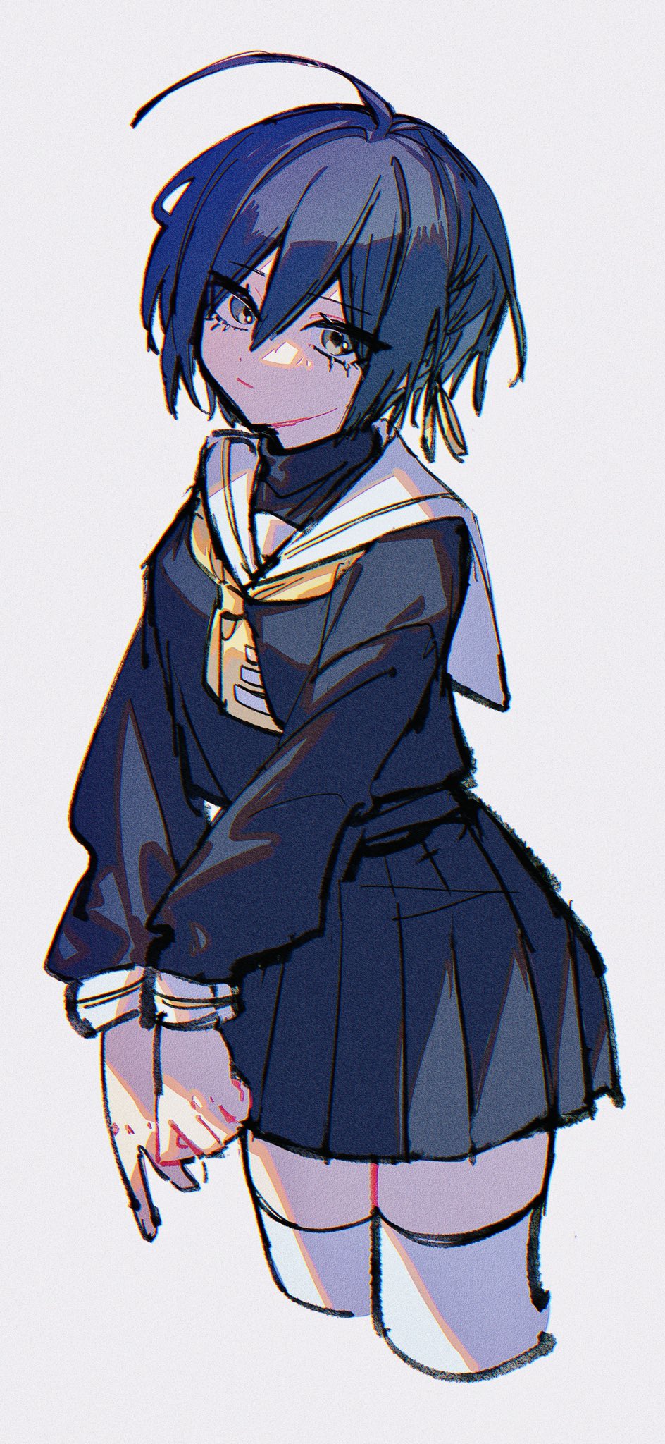 1girl ahoge blue_hair blue_serafuku blue_shirt blue_skirt blue_sleeves braid closed_mouth collared_shirt commentary cropped_legs danganronpa_(series) danganronpa_v3:_killing_harmony expressionless eyelashes genderswap genderswap_(mtf) grey_background hair_between_eyes hair_ribbon highres long_sleeves looking_at_viewer miniskirt neckerchief pleated_skirt puffy_long_sleeves puffy_sleeves ribbon saihara_shuichi sailor_collar school_uniform serafuku shirt short_hair side_braid simple_background skirt skirt_set solo untranslatable_commentary thighhighs turtleneck turtleneck_shirt undershirt white_sailor_collar white_thighhighs yellow_eyes yellow_neckerchief yellow_ribbon ze_ro_saiji zettai_ryouiki