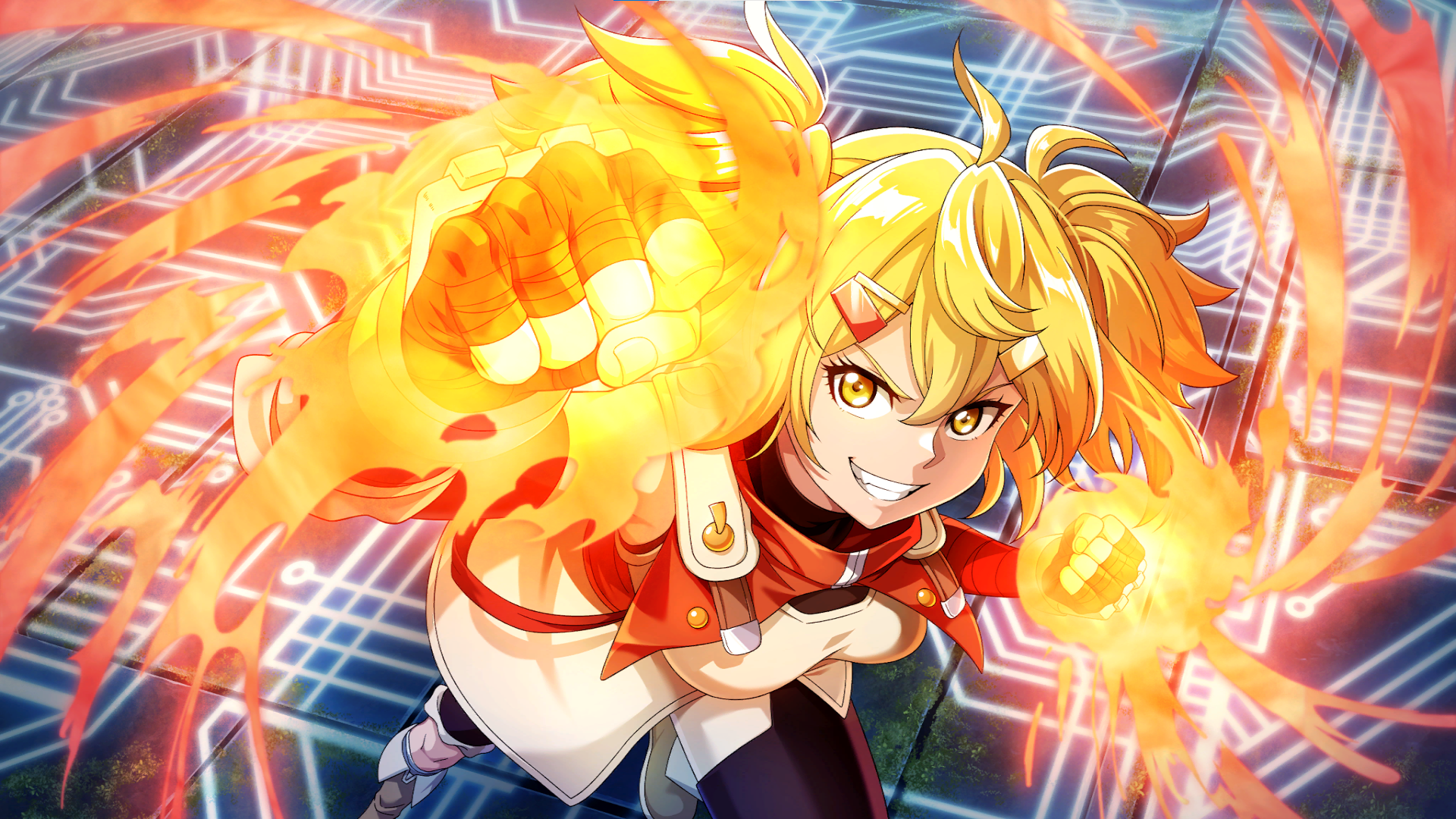 1girl bare_shoulders belt blonde_hair breasts crossover female_focus fighting_stance fingerless_gloves fire gloves hair_ornament highres kage_no_jitsuryokusha_ni_naritakute! looking_at_viewer medium_breasts official_art oikatzuo shangri-la_frontier sleeveless smile solo twintails uoi_kei yellow_eyes