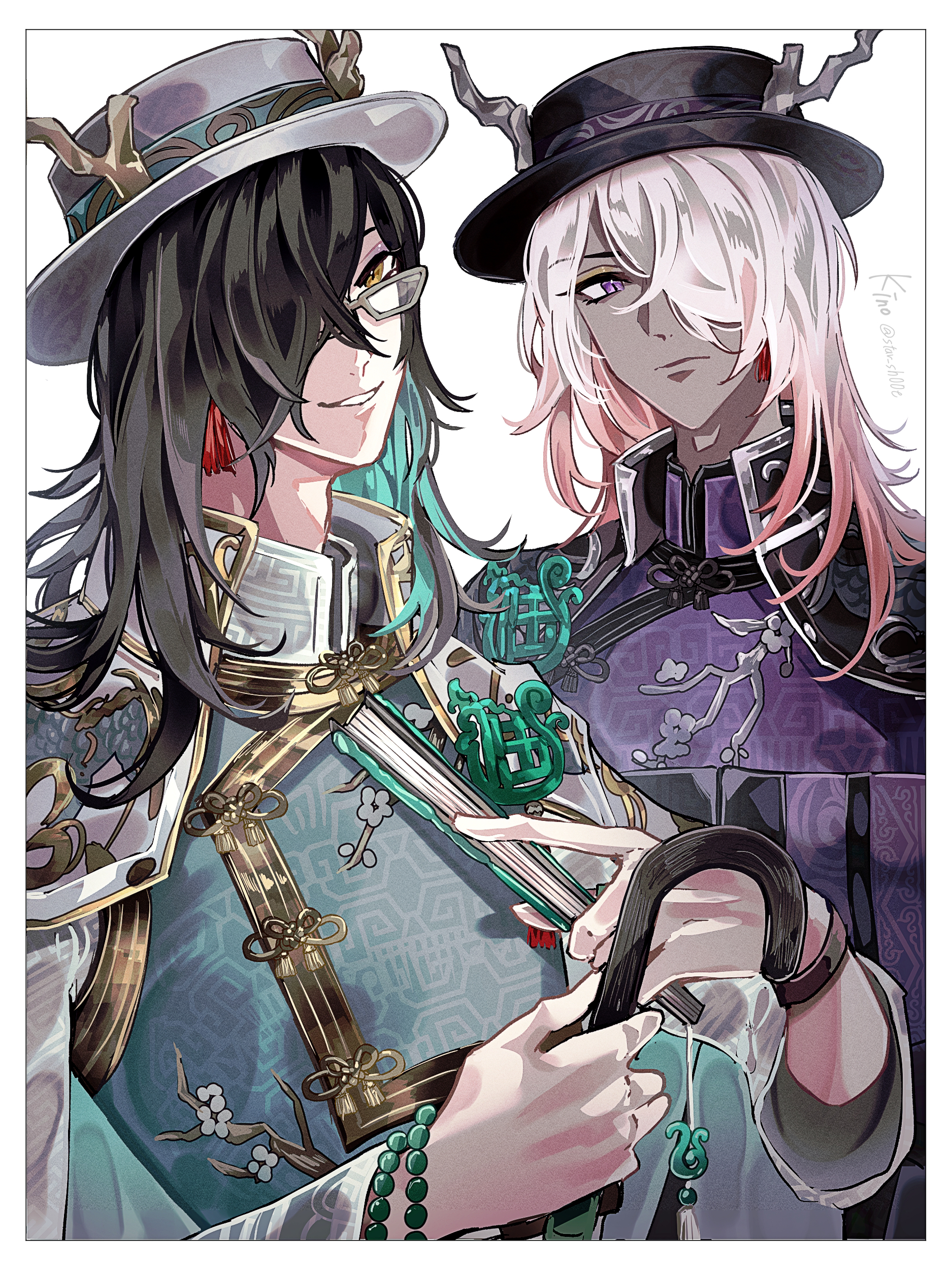 2boys absurdres aqua_hair aqua_robe bead_bracelet beads black_hair black_hat black_jacket boater_hat border bracelet brooch changpao chinese_clothes closed_mouth closed_umbrella colored_inner_hair colored_skin earrings expressionless eyeshadow fake_horns fan_wujiu fan_wujiu_(qilin_merchant) folded_fan folding_fan glasses gold_trim gradient_hair grey-framed_eyewear grey_skin hair_over_one_eye hand_fan hands_in_opposite_sleeves hat highres holding holding_fan holding_umbrella horned_headwear horns identity_v jacket jacket_on_shoulders jade_(gemstone) jewelry kino_(uni_sk38) long_hair long_sleeves looking_at_viewer makeup male_focus multicolored_hair multiple_boys official_alternate_costume parted_lips pink_hair purple_eyes purple_eyeshadow purple_robe robe silver_trim simple_background single_earring smile tassel tassel_earrings umbrella upper_body white_background white_border white_hair white_hat white_jacket white_sleeves xie_bi'an xie_bi'an_(qilin_merchant) xie_bian yellow_eyes yellow_eyeshadow
