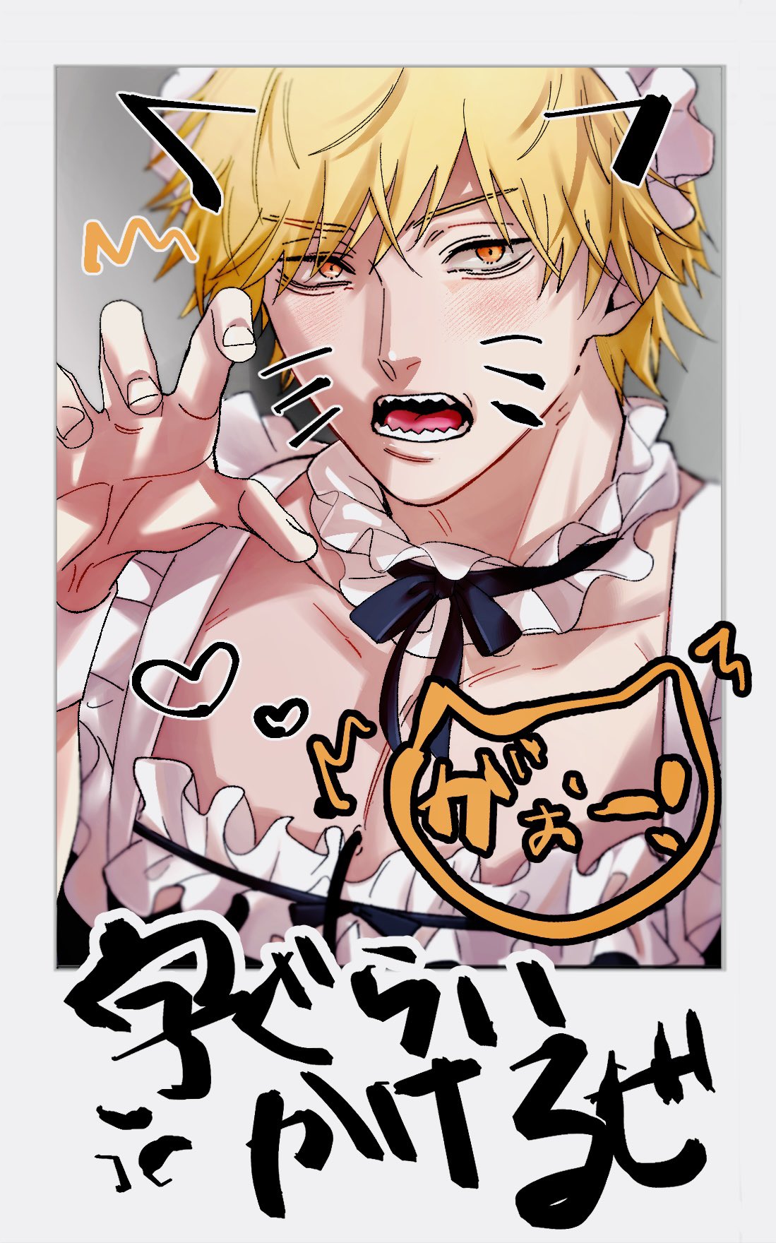 animal_ears apron black_bow black_bowtie blonde_hair border bow bowtie cat_ears chainsaw_man collar denji_(chainsaw_man) doodle_inset fake_photograph frilled_collar frills gao heart highres light_blush looking_at_viewer maid_apron maid_headdress orange_eyes polaroid_photo sharp_teeth short_hair siraco_(sira5_3) sound_effects teeth tongue translation_request white_border white_collar