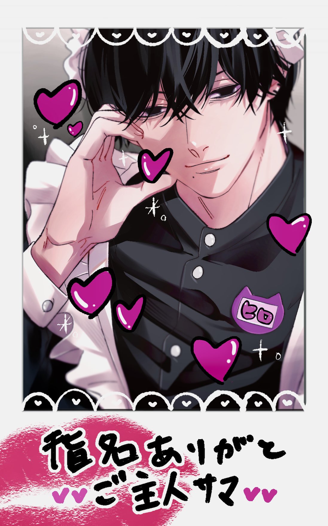 1boy apron black_eyes black_jacket border buttons chainsaw_man closed_mouth doodle_inset fake_photograph gradient_background hair_between_eyes heart highres jacket lipstick_mark maid_apron maid_headdress male_focus mole mole_under_mouth polaroid_photo siraco_(sira5_3) solo sparkle translation_request white_border yoshida_hirofumi