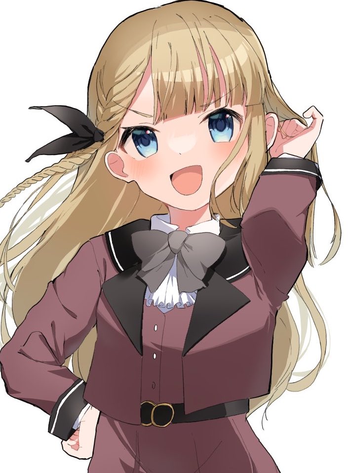 1girl :d belt black_belt blazer blonde_hair blue_eyes blunt_bangs blush bow bowtie braid brown_jacket brown_skirt brown_vest collared_shirt commentary grey_bow grey_bowtie hand_in_own_hair hand_on_own_hip idoly_pride jacket long_braid long_hair long_sleeves looking_at_viewer narumiya_suzu open_mouth pleated_skirt shirt side_braid simple_background skirt smile solo tesa_otaku v-shaped_eyebrows vest white_background white_shirt