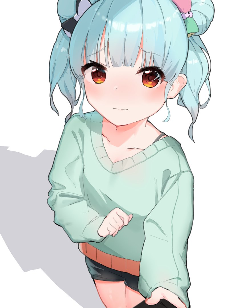 1girl 3: black_bow black_shorts blue_hair blunt_bangs blush bow collarbone commentary_request cowboy_shot double_bun flat_chest green_bow green_sweater hair_bow hair_bun hand_up hyodou_shizuku idoly_pride light_blue_hair long_sleeves looking_at_viewer orange_eyes pink_bow pov raised_eyebrows shadow shorts sidelighting sidelocks solo sweater tesa_otaku twintails two-tone_bow white_background white_bow