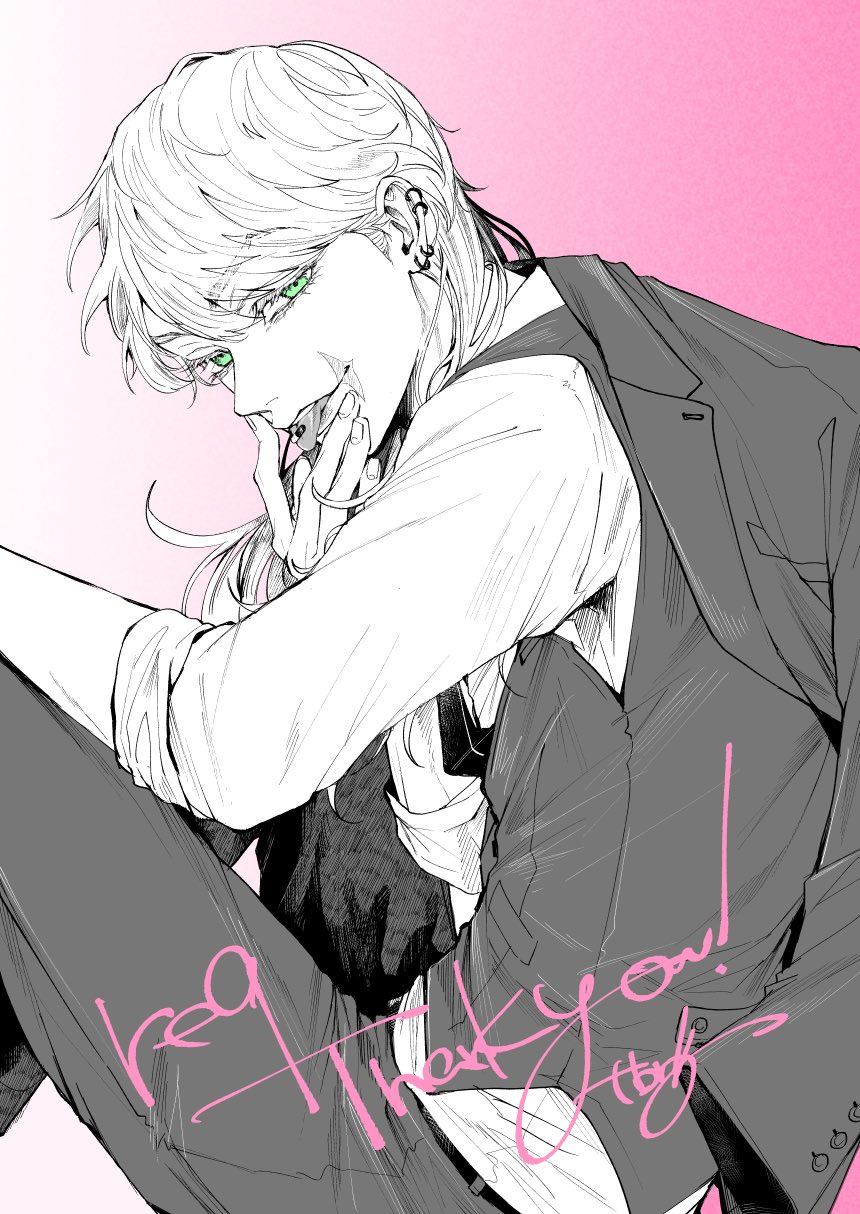 1boy ear_piercing english_text eyelashes from_side green_eyes greyscale hand_on_own_knee hand_to_own_mouth head_tilt highres jacket jacket_on_shoulders looking_at_viewer male_focus monochrome pants parted_lips piercing pill pill_in_mouth pink_background rkgktbr sanzu_haruchiyo scar scar_on_face shirt simple_background sitting sleeves_rolled_up solo spot_color tokyo_revengers tongue tongue_out upper_body vest