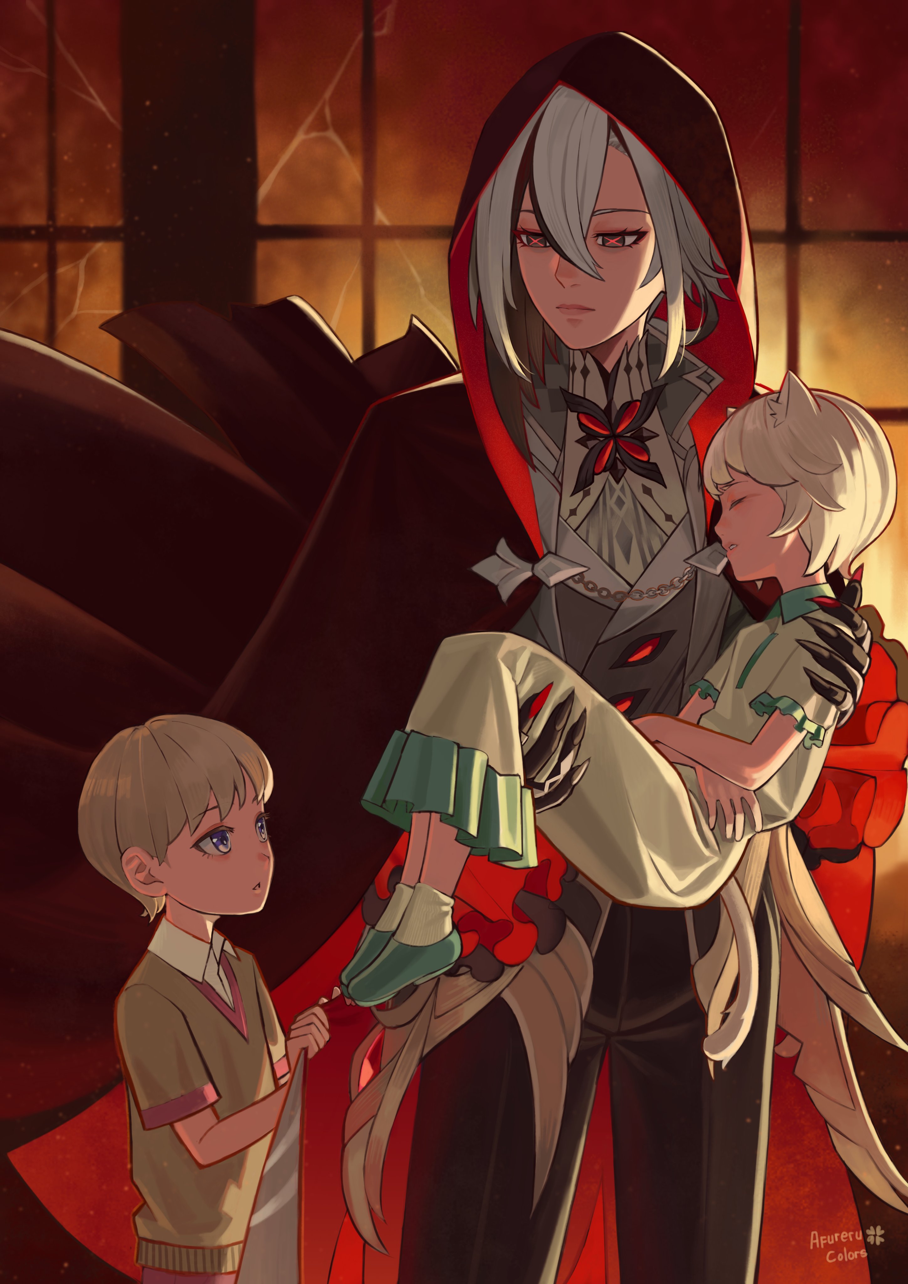 1boy 2girls absurdres afureru_colors aged_down alternate_costume animal_ear_fluff animal_ears arlecchino_(genshin_impact) artist_name black_cape black_eyes black_hair black_hands black_pants blue_footwear broken_window brother_and_sister brown_shirt burning burning_building cape carrying cat_ears cat_girl cat_tail child closed_eyes collared_shirt colored_extremities dress fingernails fire genshin_impact grey_hair grey_jacket grey_shirt hands_up highres holding hood hooded_cape jacket lapels light_brown_hair lips long_fingernails looking_at_another looking_down looking_up lynette_(genshin_impact) lyney_(genshin_impact) multicolored_hair multiple_girls open_mouth outdoors pants princess_carry puffy_short_sleeves puffy_sleeves purple_eyes red_cape red_pupils shirt shoes short_hair short_sleeves siblings sidelocks socks standing symbol-shaped_pupils t-shirt tail two-sided_cape two-sided_fabric two-tone_hair white_dress white_hair white_shirt white_socks window x-shaped_pupils