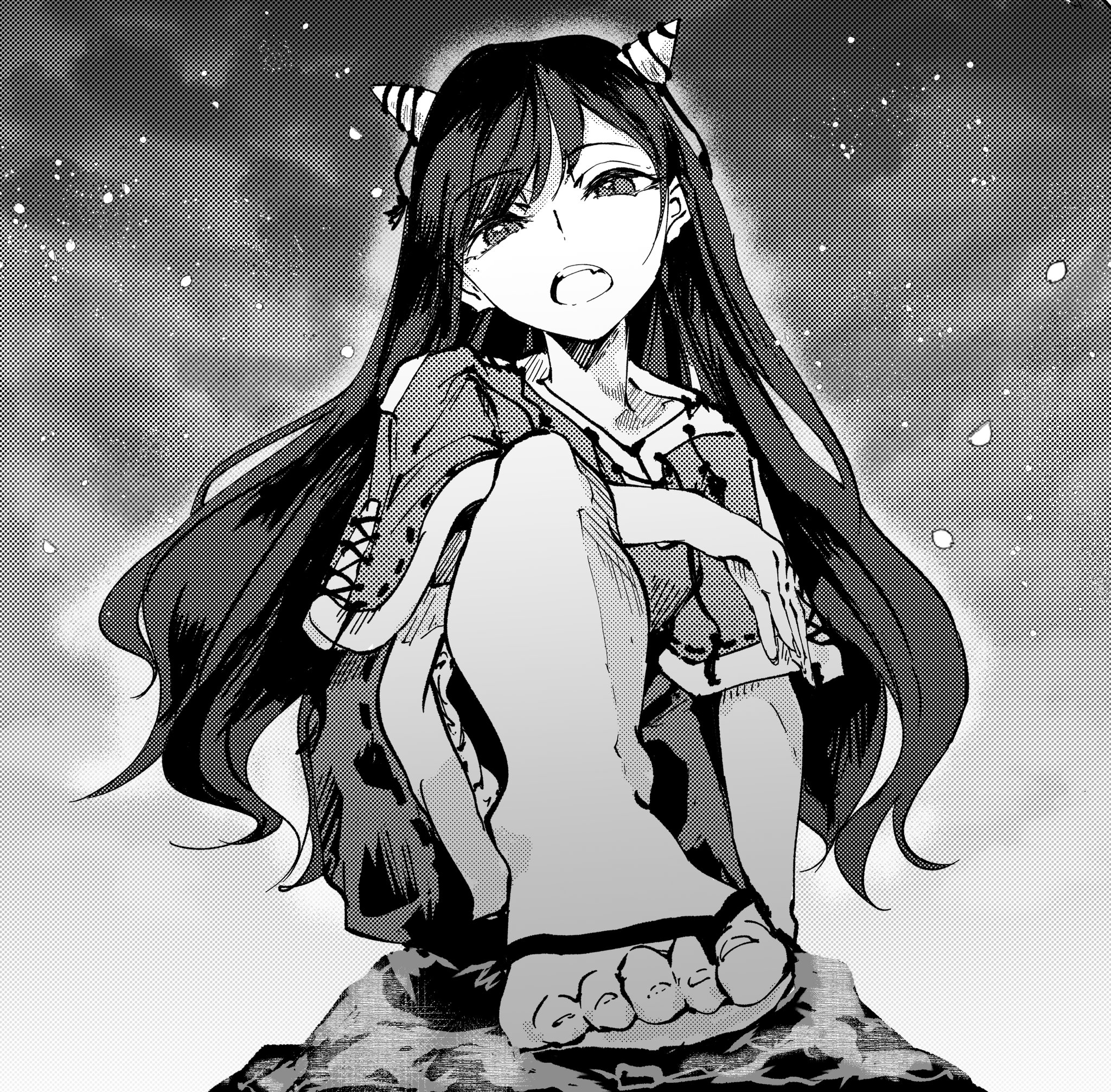 1girl commentary_request cone_horns fang flip-flops foreshortening greyscale head_tilt highres horns long_hair looking_at_viewer monochrome mouryou_(chimimouryou) nippaku_zanmu open_mouth outdoors rock sandals shirt short_sleeves shorts solo tassel toenails toes touhou very_long_hair