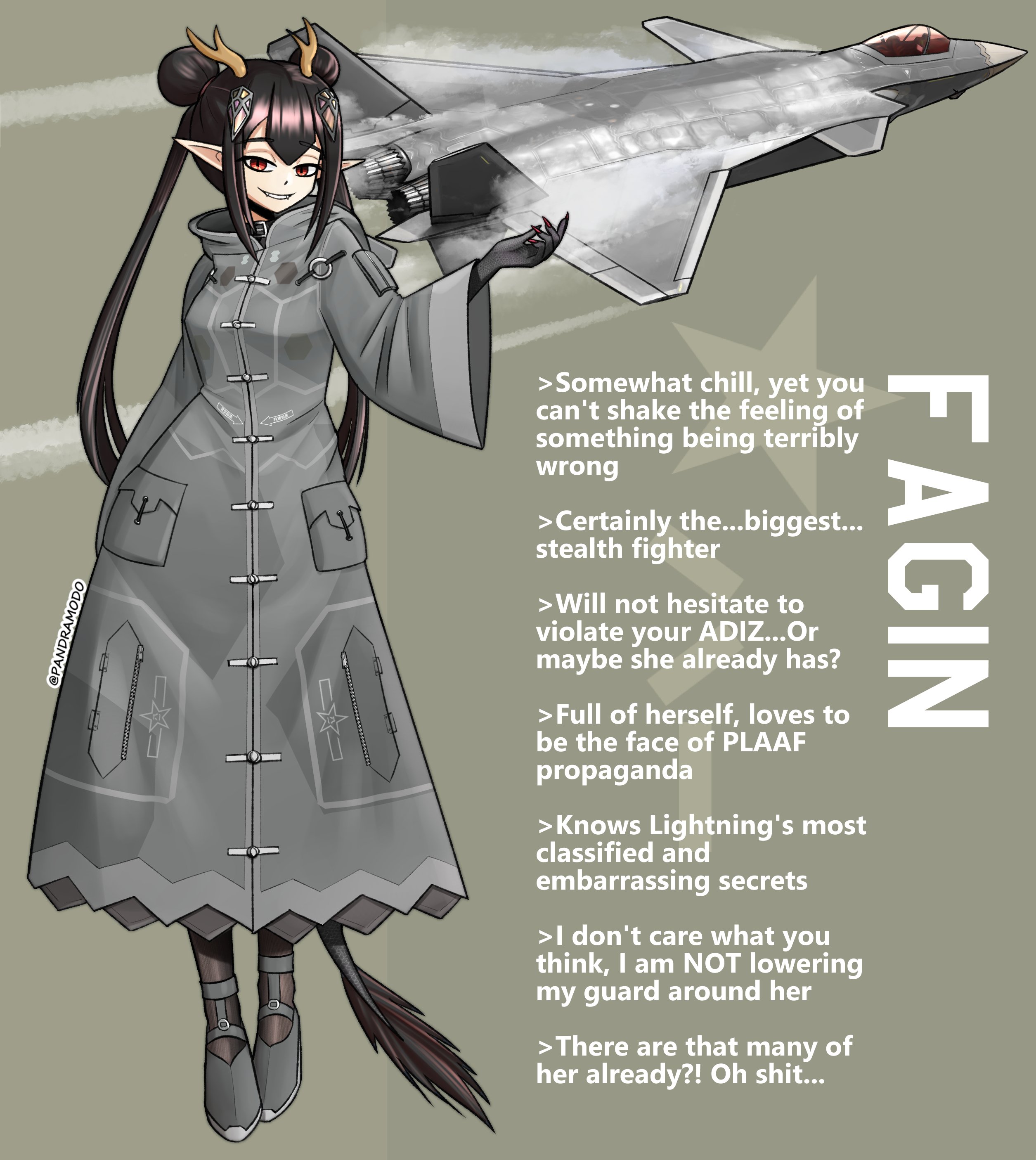 1girl absurdres aircraft airplane canards chengdu_j-20 coat commentary english_commentary english_text fangs fighter_jet full_body grey_background grey_coat grey_footwear highres horns long_sleeves military_vehicle original pandramodo parted_lips people's_liberation_army people's_liberation_army_air_force personification pointy_ears simple_background smile solo standing tail teeth