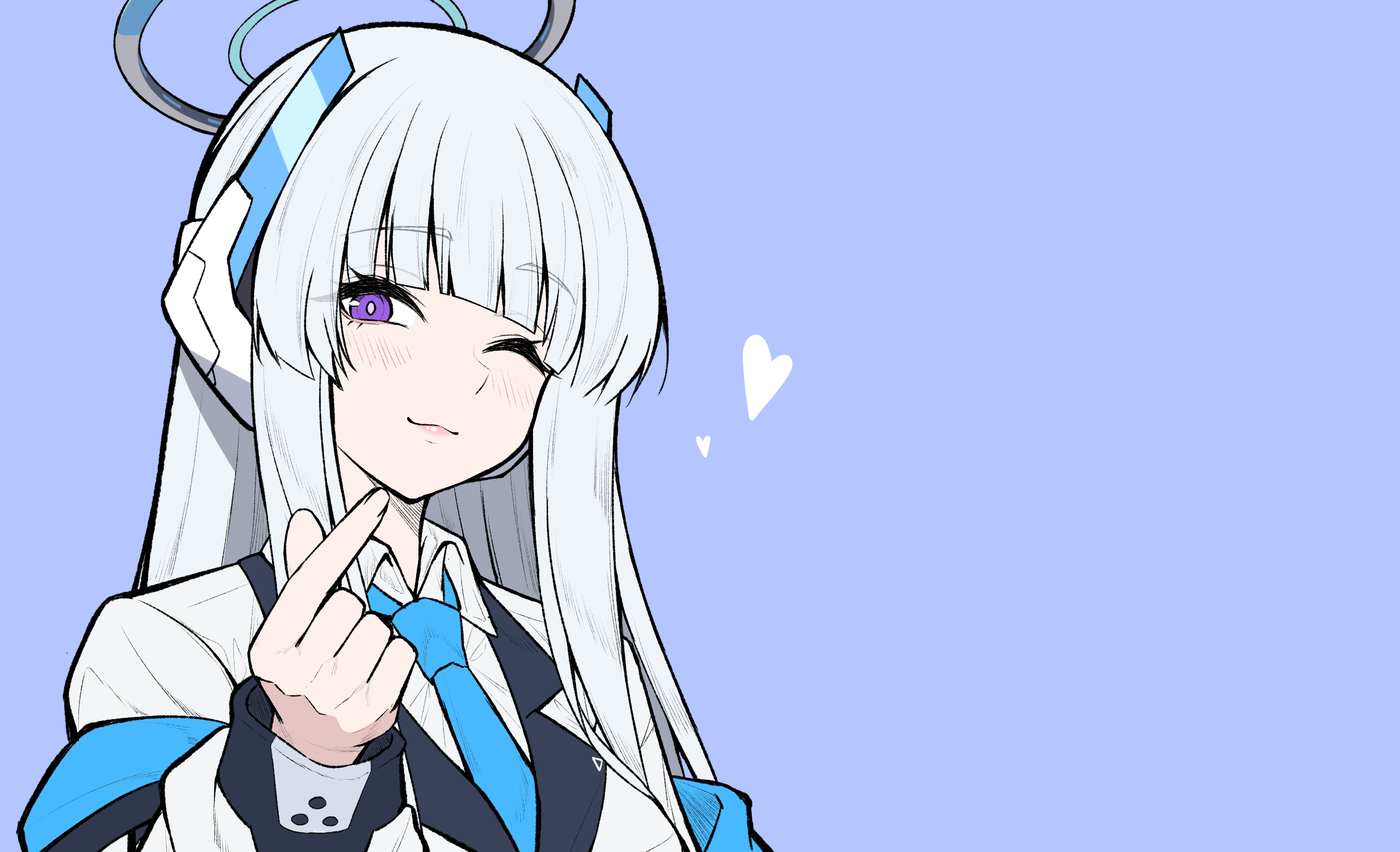 1girl ;3 blue_archive blue_necktie blush closed_mouth coat collared_shirt commentary cropped_arm finger_heart halo hand_up headgear highres jacket long_sleeves looking_at_viewer necktie noa_(blue_archive) off_shoulder one_eye_closed open_clothes open_jacket purple_eyes reia_76 shirt smile solo upper_body white_coat white_hair white_halo white_jacket white_shirt
