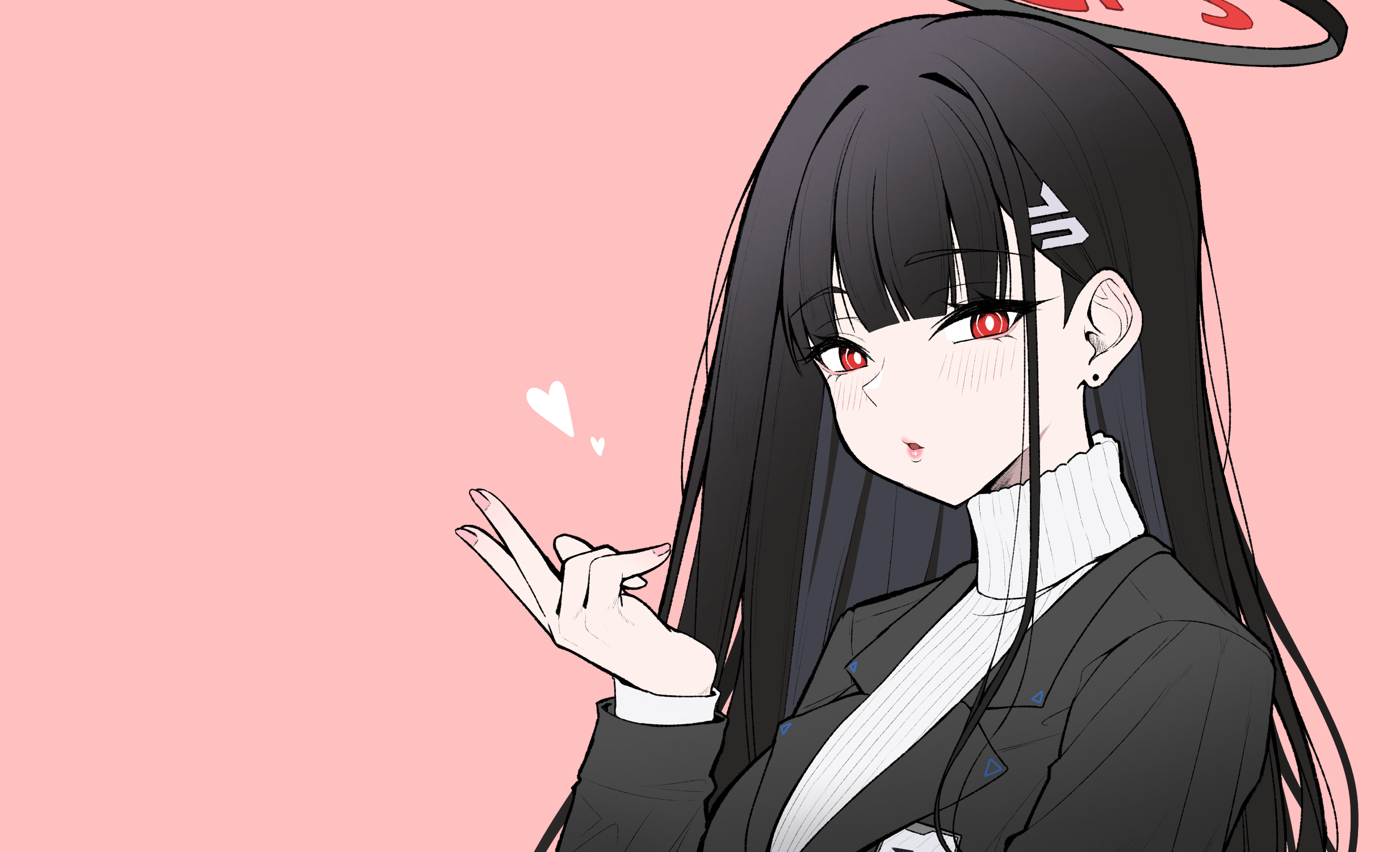 1girl black_coat black_hair black_halo blowing_kiss blue_archive blush bright_pupils coat commentary cropped_arm earrings fingernails hair_ornament hairpin halo highres jewelry lapels long_hair long_sleeves looking_at_viewer nail_polish pink_background pink_lips pink_nails puckered_lips red_eyes reia_76 ribbed_sweater rio_(blue_archive) simple_background solo stud_earrings sweater turtleneck turtleneck_sweater upper_body white_pupils white_sweater