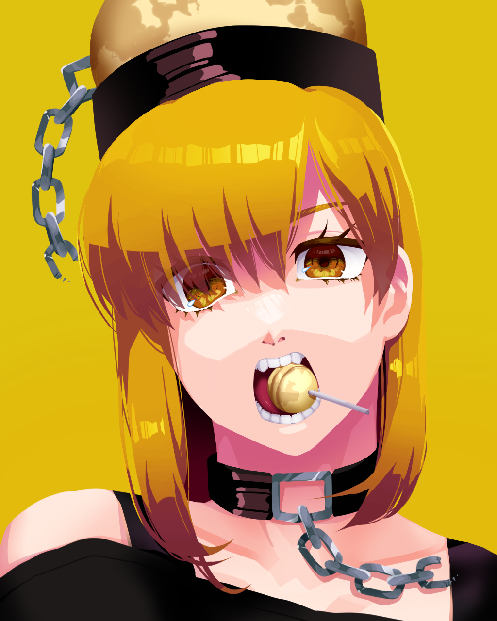 1girl bare_shoulders black_shirt blonde_hair broken broken_chain candy chain collar commentary_request eyelashes eyes_visible_through_hair food hair_behind_ear hair_between_eyes head_tilt hecatia_lapislazuli hecatia_lapislazuli_(moon) highres lollipop long_hair looking_at_viewer mixed-language_commentary mouth_hold nostrils off-shoulder_shirt off_shoulder open_mouth portrait shirt silver_chain simple_background solo straight-on takayo_(user_yeah3737) teeth tongue touhou uneven_eyes yellow_background yellow_eyes