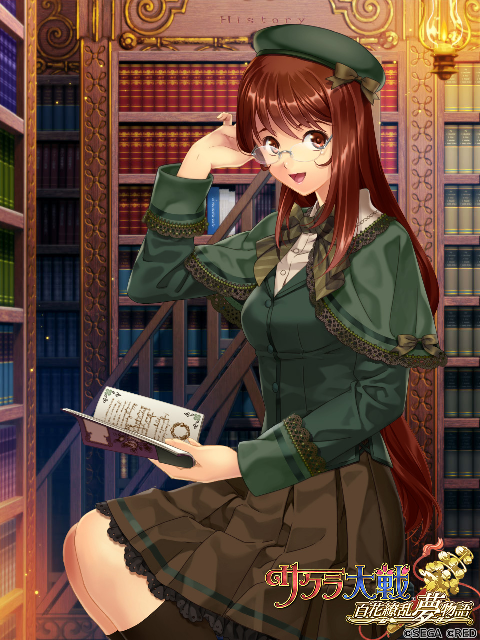 1girl adjusting_eyewear black_lace_trim black_socks book bow brown_eyes brown_hair buttons capelet choker collar collared_jacket collared_shirt commentary copyright_name copyright_notice dress_shirt english_text erica_fontaine game_cg glasses green_bow green_capelet green_collar green_hair green_jacket green_sleeves hat hat_ribbon highres holding holding_book jacket lace-trimmed_capelet lace-trimmed_wrist_cuffs lace_trim library logo long_hair looking_at_viewer low-tied_long_hair official_art open_mouth pleated_skirt ribbon ribbon_choker sakura_taisen sakura_taisen_iii sega shirt sidelocks sitting skirt socks solo stairs striped_capelet striped_clothes striped_skirt wall_lamp white_collar wrist_cuffs yuasa_tsugumi