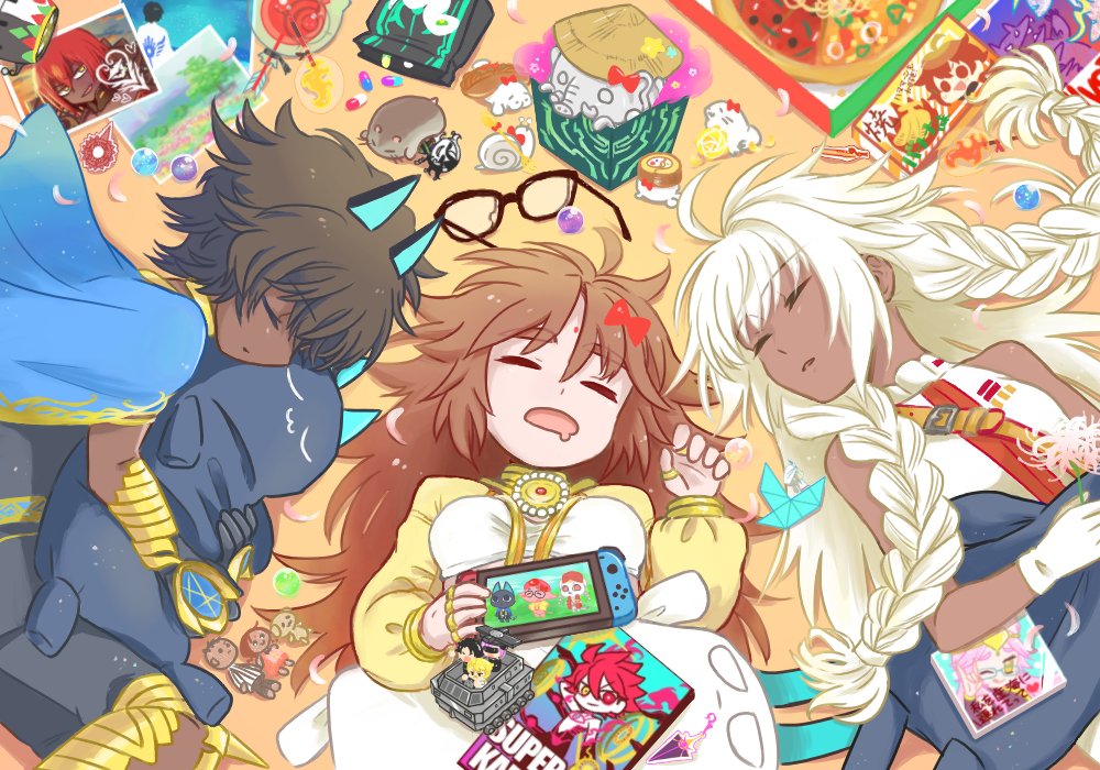 1boy 2girls ahoge ajay_(fate) animal_crossing animal_crossing:_new_horizons arjuna_(fate) arjuna_alter_(fate) arjuna_alter_(third_ascension)_(fate) asha_(fate) ashiya_douman_(fate) ashwatthama_(fate) belt black-framed_eyewear black_gloves black_hair black_shirt black_shorts blue_cape blue_capelet blue_horns bow braid breasts brown_belt brown_hair cape capelet captain_nemo_(fate) captain_nemo_(first_ascension)_(fate) character_doll closed_eyes country_connection dark-skinned_female dark-skinned_male dark_skin desi doll drooling elephant facial_mark facing_another fate/grand_order fate_(series) flower food forehead_mark fujimaru_ritsuka_(male) ganesha_(fate) glasses gloves gold_ring goredolf_musik hair_between_eyes hair_bow hamster handheld_game_console hat holding holding_flower holding_handheld_game_console holding_stuffed_toy horns hugging_object jacket jewelry jinako_carigiri karna_(fate) koyanskaya_(fate) koyanskaya_(indian_lostbelt_outfit)_(fate) lakshmibai_(fate) lakshmibai_(first_ascension)_(fate) long_hair long_sleeves lying mash_kyrielight mash_kyrielight_(ortenaus) medium_breasts mizu_manju1899 mouth_drool multiple_girls multiple_rings nemo_(fate) nintendo nintendo_switch on_back on_side open_mouth paper_boat parted_lips petals photo_(object) pill pink_flower pizza puffy_long_sleeves puffy_sleeves red_bow red_flower ring shirt short_hair shorts shoulder_belt sleeping sleeveless sleeveless_shirt small_breasts snail spider_lily strapless straw_hat stuffed_animal stuffed_toy super_karna_(fate) thumb_ring tube_top twin_braids unworn_eyewear very_long_hair vihan_(fate) white_gloves white_hair white_shirt white_tube_top yellow_jacket