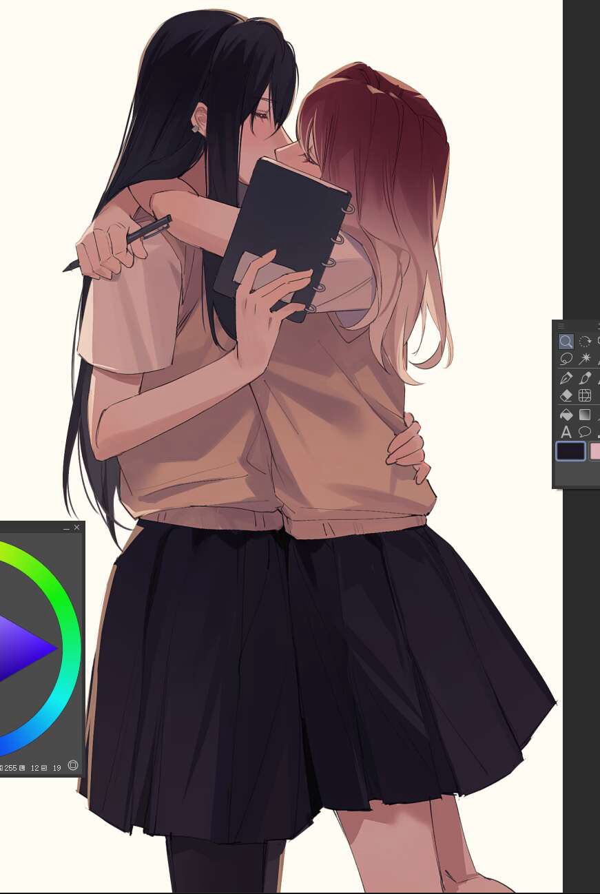 2girls arms_around_neck art_program_in_frame black_hair black_skirt blush brown_sweater_vest closed_eyes closed_mouth contemporary cowboy_shot gradient_hair hand_on_another's_waist highres holding holding_notebook holding_pen kiss long_hair miix777 multicolored_hair multiple_girls notebook pantyhose path_to_nowhere pen pleated_skirt purple_hair rahu_(path_to_nowhere) school_uniform shalom_(path_to_nowhere) shirt short_sleeves skirt sweater_vest white_hair white_shirt yuri