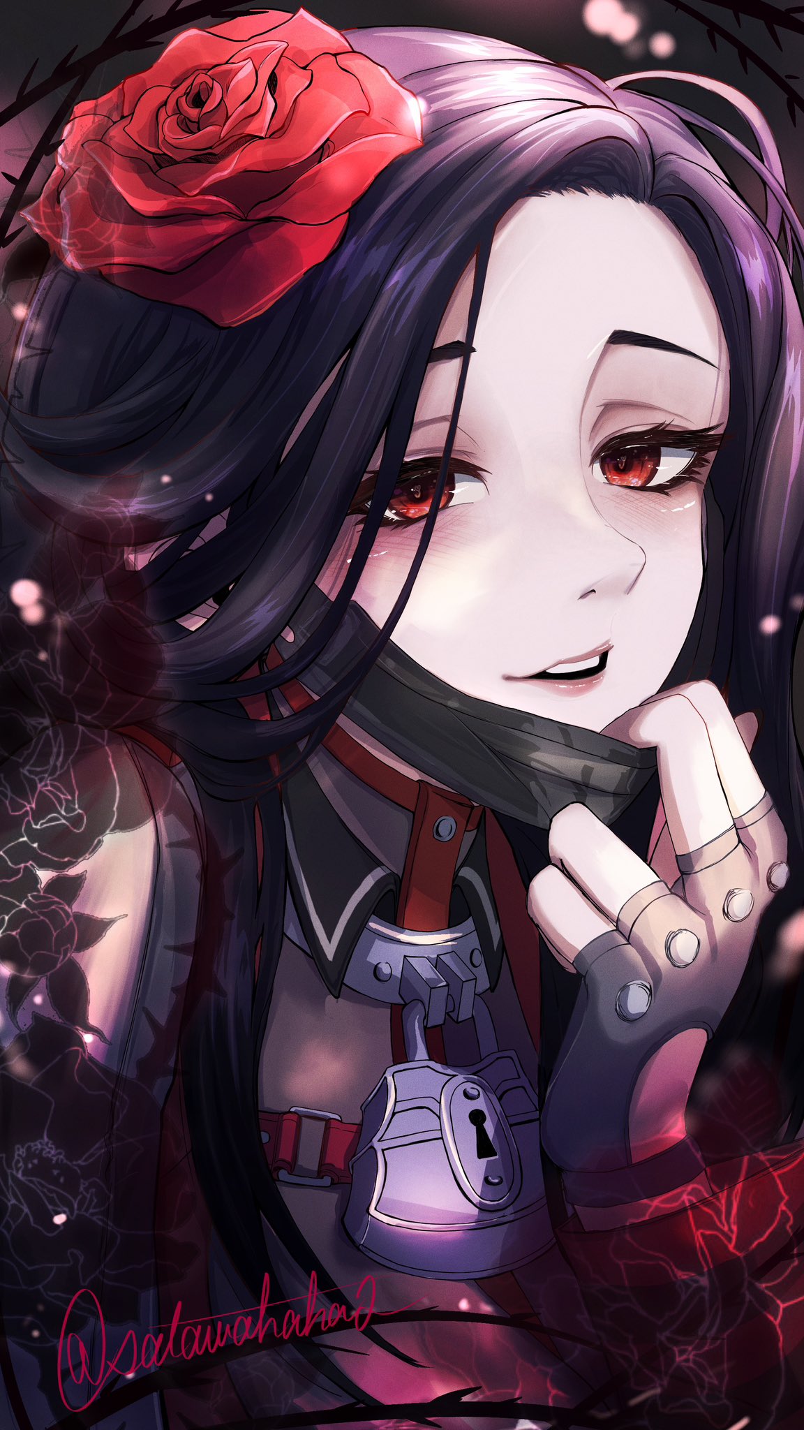 1girl artist_name black_gloves black_hair black_jacket black_mask blush collar eyelashes fingerless_gloves flower gloves goddess_of_victory:_nikke hair_flower hair_ornament highres jacket lock long_hair looking_at_viewer maiden_(nikke) mask mask_pull mouth_mask parted_bangs red_eyes red_flower sata_(satawahaha) solo