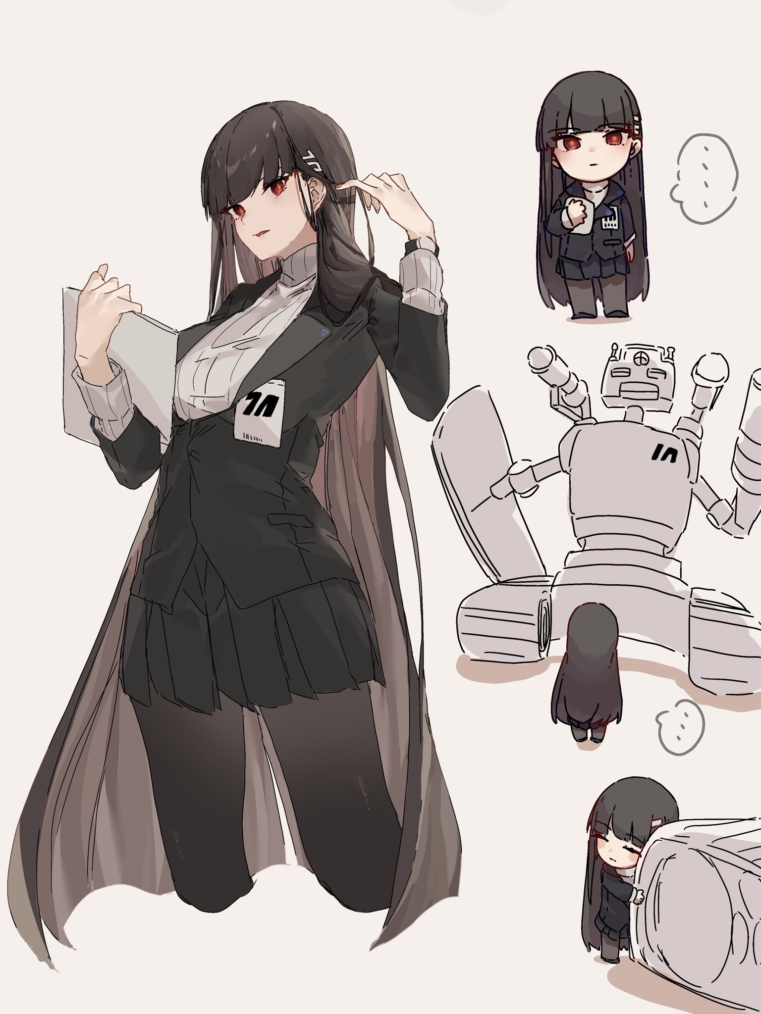 anmochi_mochi avant_garde_(blue_archive) black_hair black_jacket blue_archive chibi cropped_legs hair_ornament hairclip highres holding hugging_object jacket name_tag red_eyes rio_(blue_archive) robot speech_bubble turtleneck