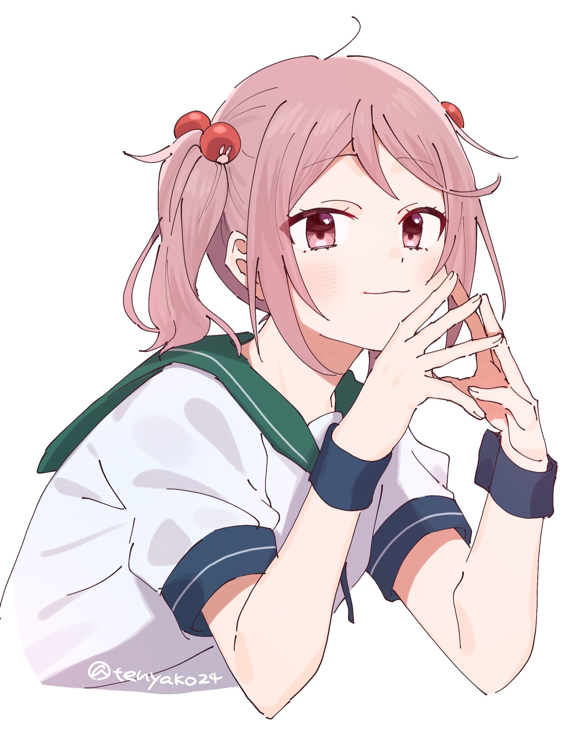 1girl blush closed_mouth cropped_torso green_sailor_collar hair_bobbles hair_ornament highres kantai_collection looking_at_viewer pink_eyes pink_hair sailor_collar sazanami_(kancolle) school_uniform serafuku short_sleeves short_twintails simple_background solo steepled_fingers tenyako_(mirasato24) twintails twitter_username upper_body white_background