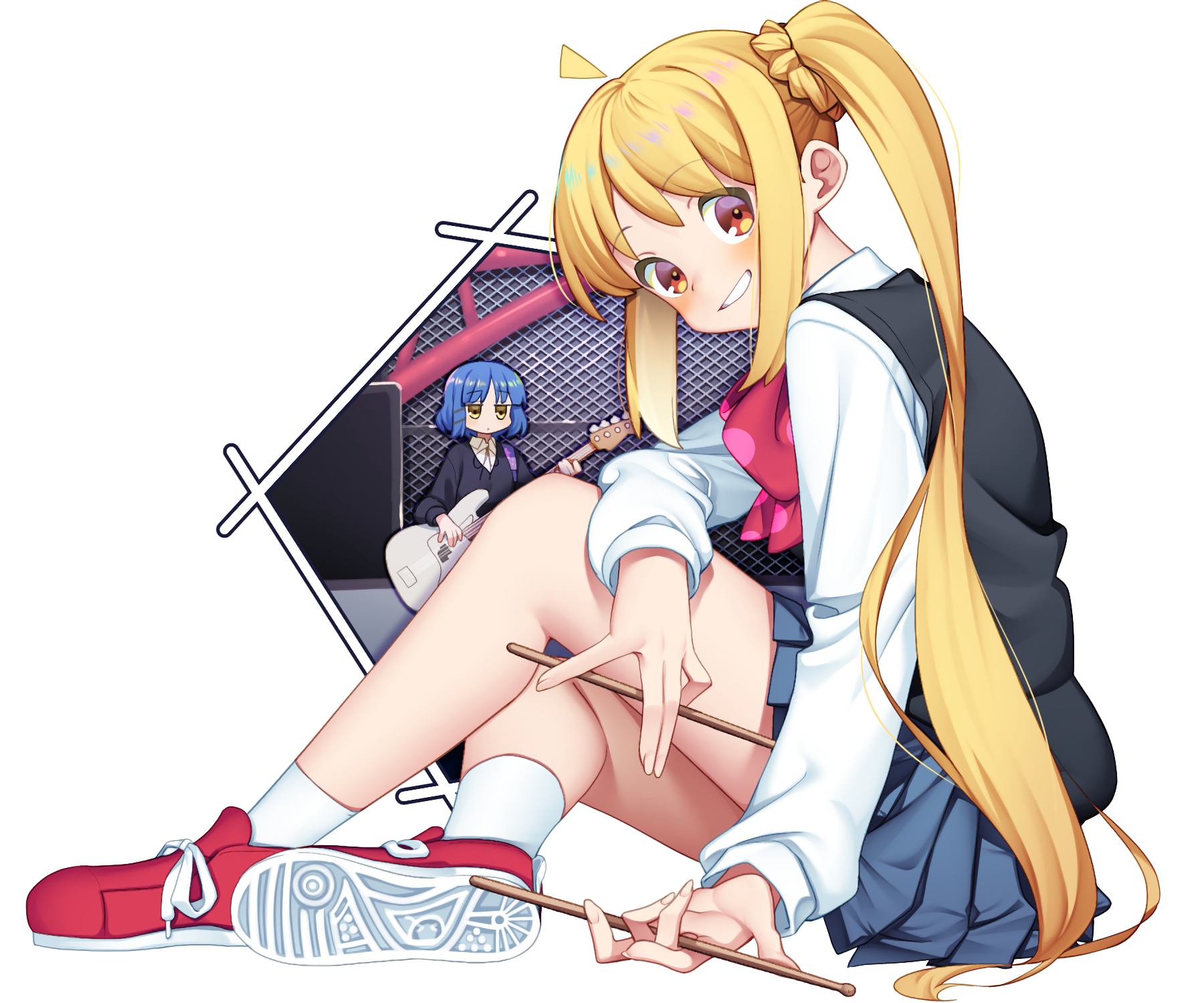 2girls ahoge black_jacket black_vest blonde_hair blue_hair blue_skirt bocchi_the_rock! bow bowtie commentary_request detached_ahoge drumsticks full_body grin guitar highres holding holding_drumsticks holding_guitar holding_instrument ijichi_nijika instrument jacket knee_up long_hair long_sleeves looking_at_viewer motsu_momomo multiple_girls orange_eyes pleated_skirt red_bow red_bowtie red_footwear school_uniform shimokitazawa_high_school_uniform shirt shoe_soles short_hair sidelocks sitting skirt smile socks twintails very_long_hair vest white_shirt white_socks yamada_ryo yellow_eyes