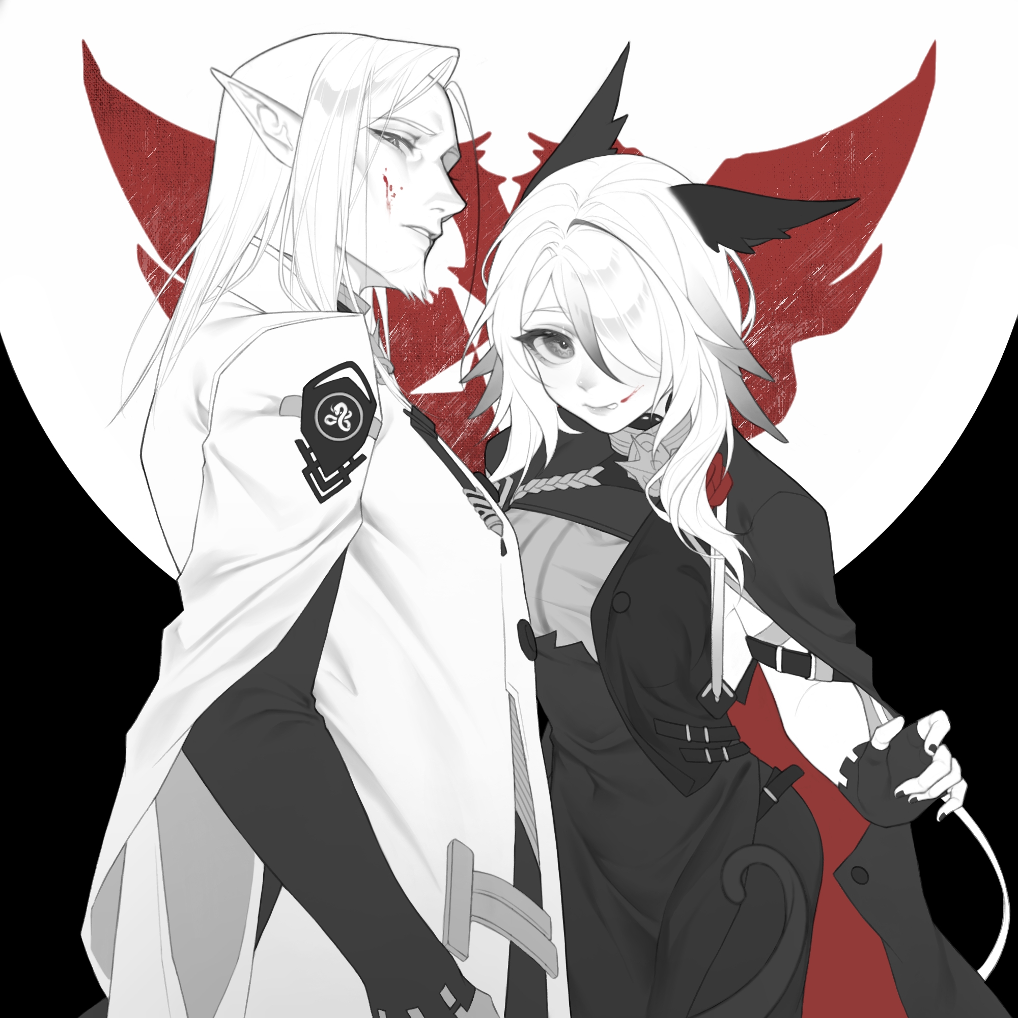 1boy 1girl animal_ears arknights bird_ears black_dress black_gloves blood blood_on_face cape coat commentary_request cowboy_shot dress duke_kashchey_(arknights) facial_hair fingerless_gloves gloves goatee hair_over_one_eye highres koshelna_(arknights) long_hair long_sleeves looking_at_viewer one_eye_covered parted_lips partially_colored pointy_ears white_coat yi_zhi_qiu_qiu_qiu