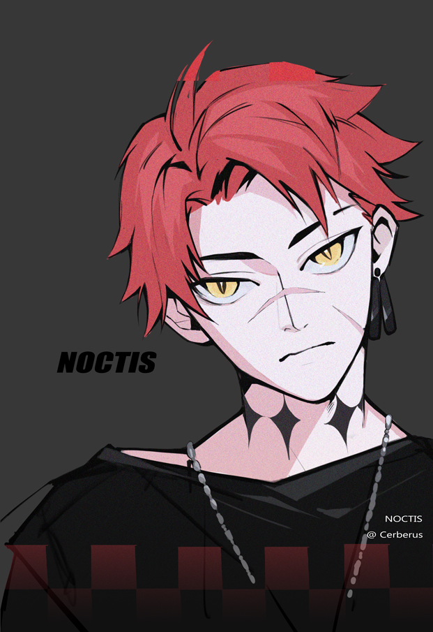 18_kawaki 1boy black_background black_shirt character_name cross_tattoo earrings facial_scar jewelry neck_tattoo noctis_(pgr) parted_bangs punishing:_gray_raven red_hair scar scar_on_cheek scar_on_face shirt short_hair slit_pupils solo tassel tassel_earrings tattoo yellow_eyes