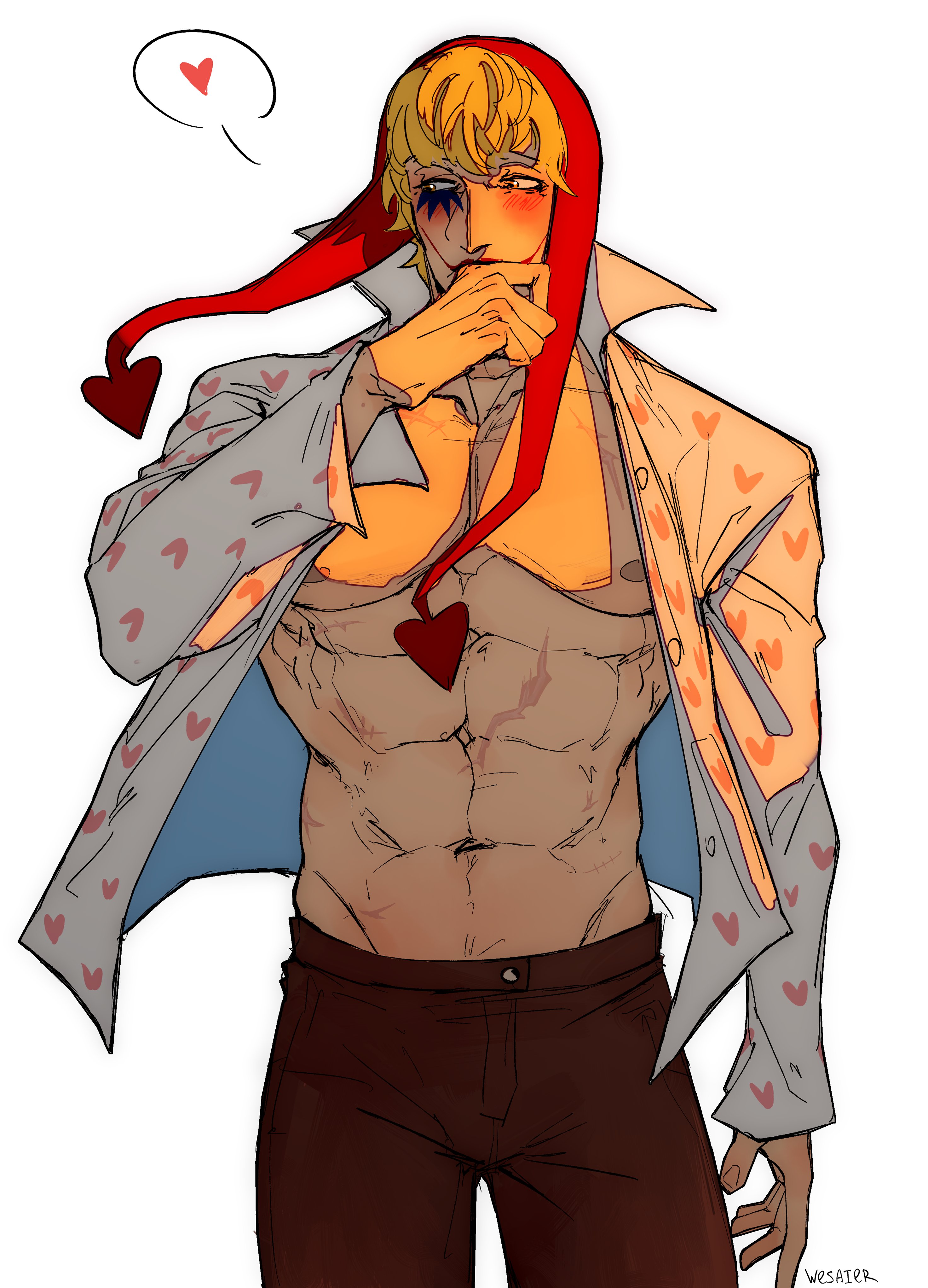 1boy abs absurdres artist_name bare_pectorals blonde_hair blush commentary cowboy_shot donquixote_rocinante facepaint floating_clothes heart heart_print highres hood looking_to_the_side makeup male_focus one_piece open_clothes open_shirt pectorals scar scar_on_chest simple_background solo wesaier white_background