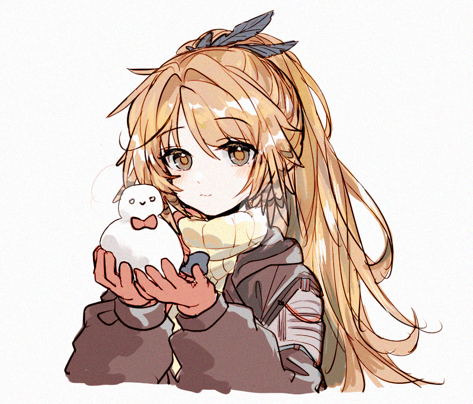 1girl arknights black_eyes black_jacket blush closed_mouth cropped_torso dot_nose feather_hair gloves hair_between_eyes hair_intakes half_updo hansuitianer high_ponytail holding_snowman jacket long_hair long_sleeves looking_at_viewer open_clothes open_jacket orange_hair orange_pupils own_hands_together pinecone_(arknights) ponytail red_gloves sidelocks simple_background smile snowman solo sweater turtleneck turtleneck_sweater white_background yellow_sweater