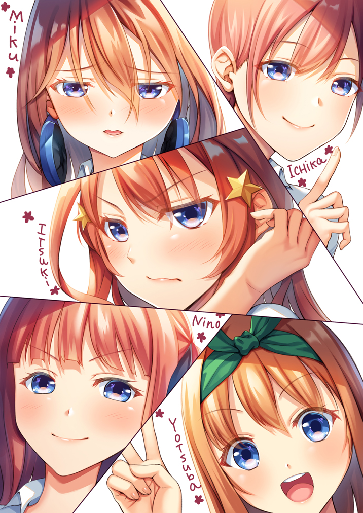5girls :d adjusting_hair blunt_bangs blush brown_hair character_name commentary_request go-toubun_no_hanayome green_ribbon hair_between_eyes hair_ornament headphones headphones_around_neck index_finger_raised kazumaru long_hair multiple_girls multiple_views nakano_ichika nakano_itsuki nakano_miku nakano_nino nakano_yotsuba open_mouth quintuplets ribbon shirt short_hair smile star_(symbol) star_hair_ornament twitter_username white_shirt
