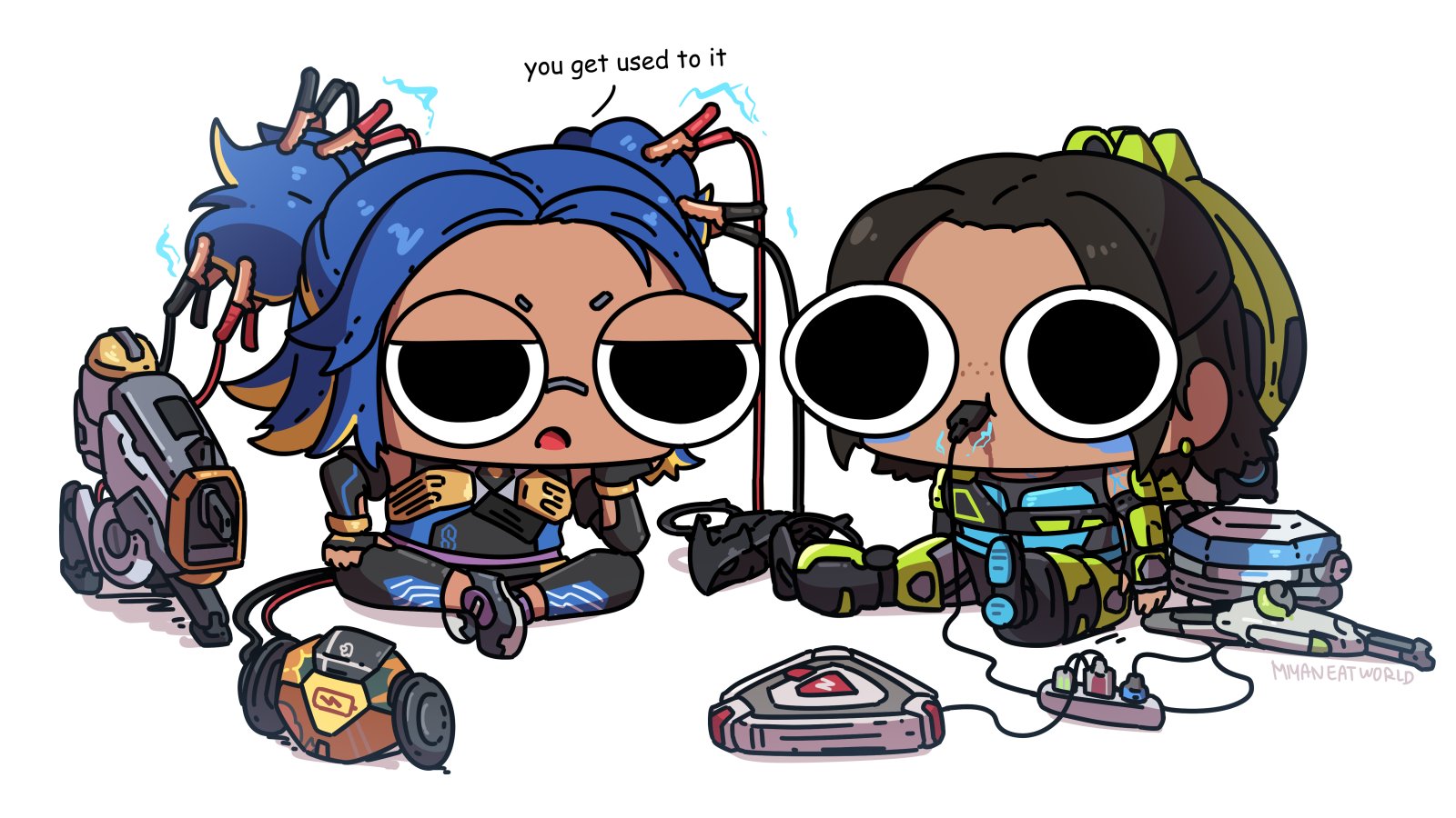 2girls annoyed apex_legends artist_name black_hair blonde_hair blue_hair cable cartoonized chibi commentary conduit_(apex_legends) country_connection crossed_legs crossover d.o.c._health_drone dark-skinned_female dark_skin english_commentary freckles hack_(apex_legends) hair_behind_ear highres jumper_cable lightning_bolt_symbol miyan_(oceanmaiden) multicolored_hair multiple_girls neon_(valorant) non-humanoid_robot philippines power_cord robot shadow sitting streaked_hair toon_(style) two_side_up valorant white_background