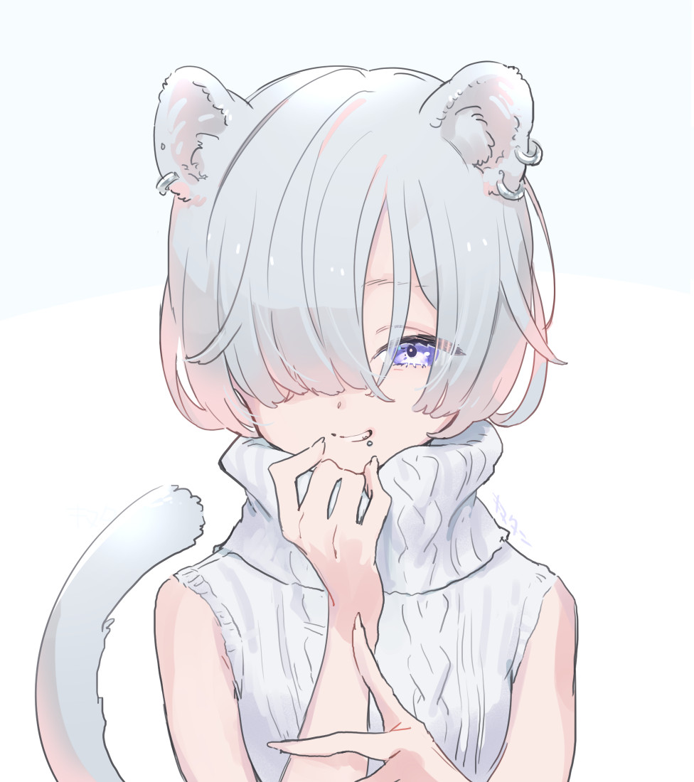 1girl animal_ear_fluff animal_ears cat_ears cat_girl cat_tail commentary_request ear_piercing fingernails grey_hair grin hair_over_one_eye half-closed_eyes hands_up kinutani_yutaka looking_at_viewer multicolored_hair original piercing pink_hair purple_eyes sharp_fingernails short_hair sleeveless sleeveless_sweater sleeveless_turtleneck smile solo streaked_hair sweater tail turtleneck turtleneck_sweater upper_body white_sweater
