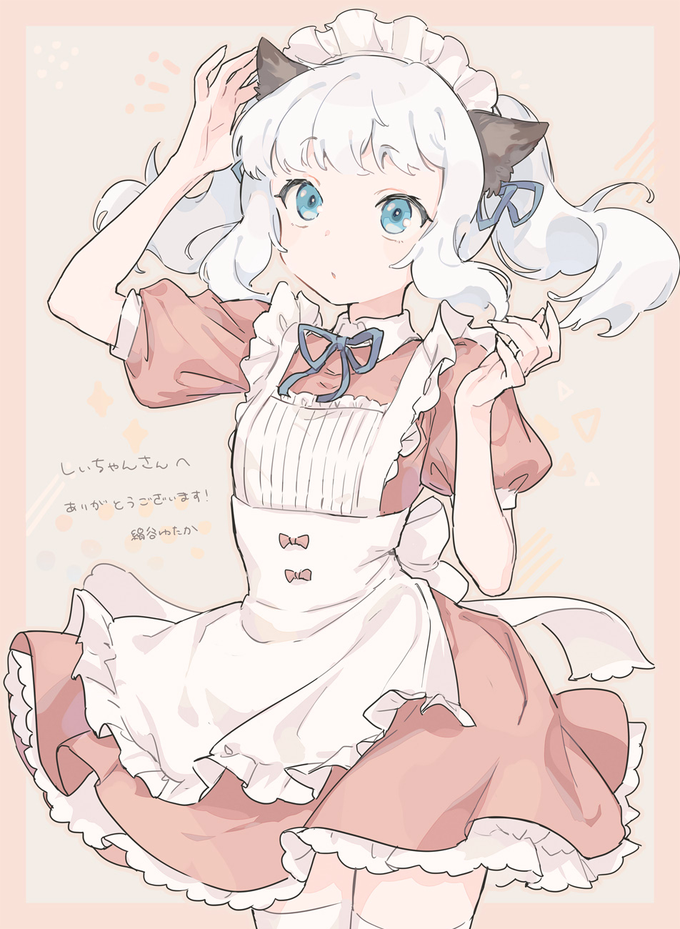 1girl :o animal_ears apron arm_up back_bow blue_eyes border bow brown_background cat_ears cat_girl collared_dress commentary_request cowboy_shot dress fingernails frilled_apron frills hand_up highres kinutani_yutaka long_hair looking_at_viewer maid maid_apron maid_headdress notice_lines orange_border original outside_border pink_dress puffy_short_sleeves puffy_sleeves sharp_fingernails short_sleeves sidelocks solo standing thighhighs translation_request two_side_up white_apron white_hair white_thighhighs